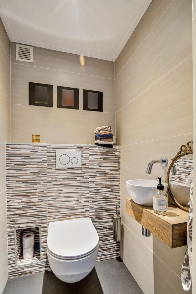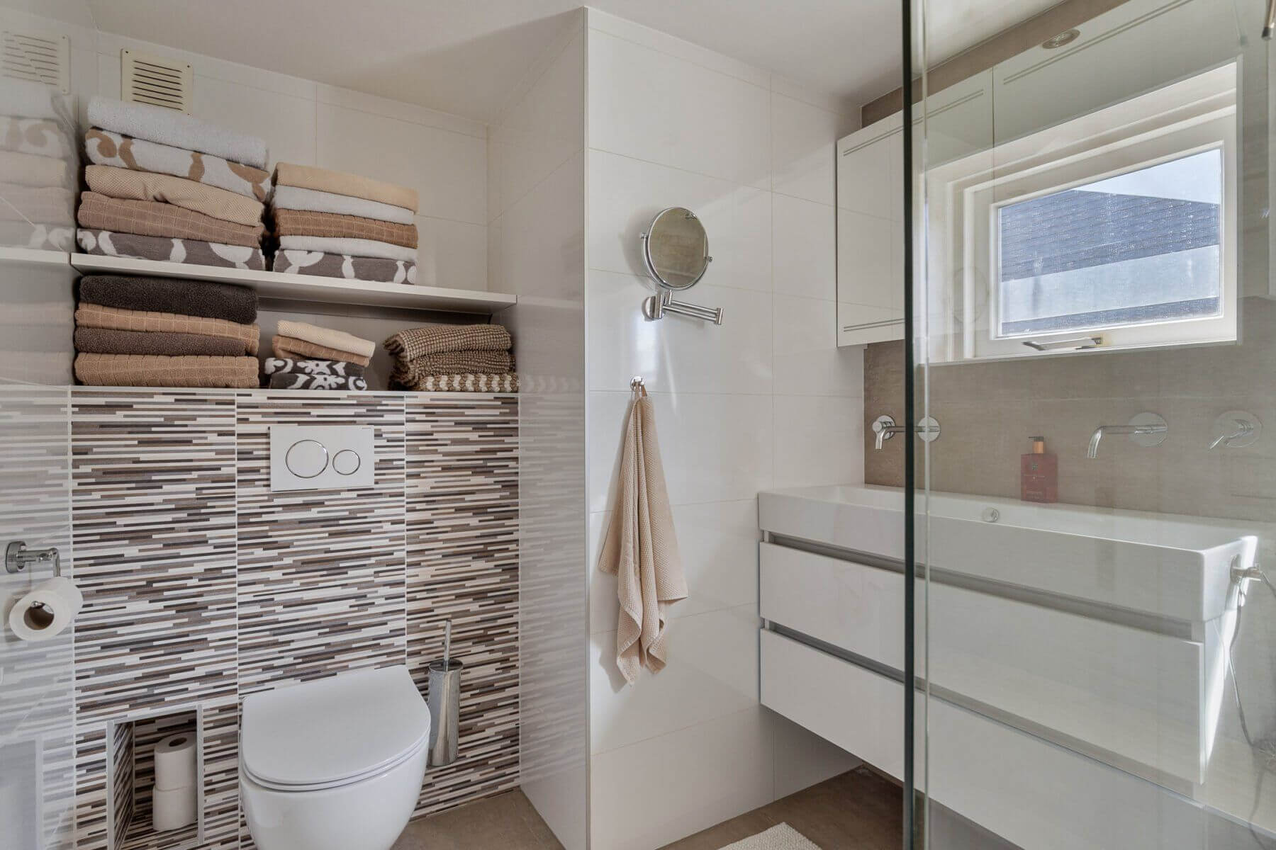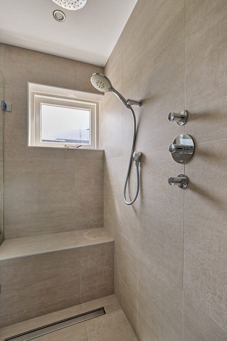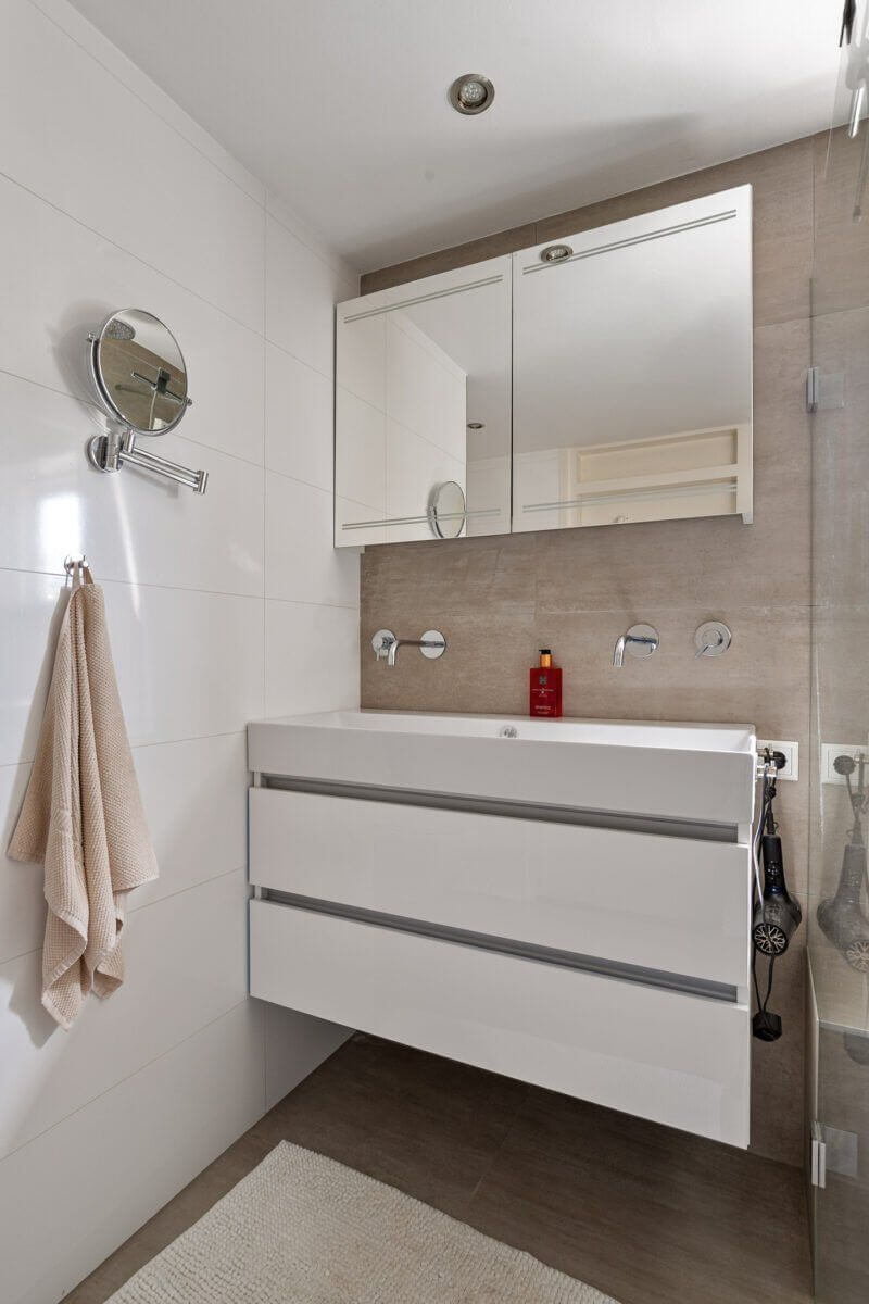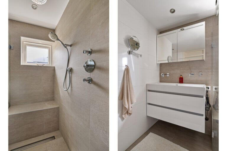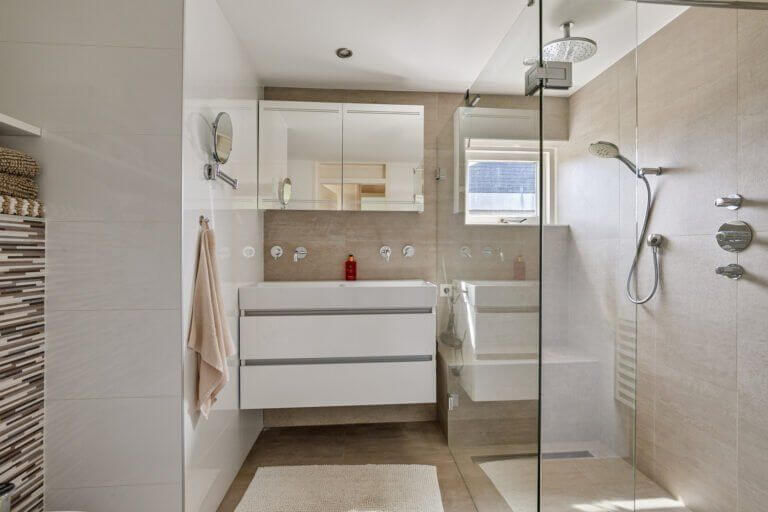 The luxurious bathroom is equipped with a modern walk-in shower, a double sink, and a toilet. The bathroom is smartly arranged and has a beautiful towel radiator and recessed spotlights for lighting.