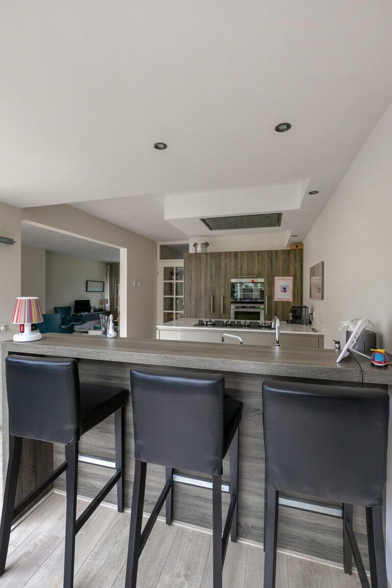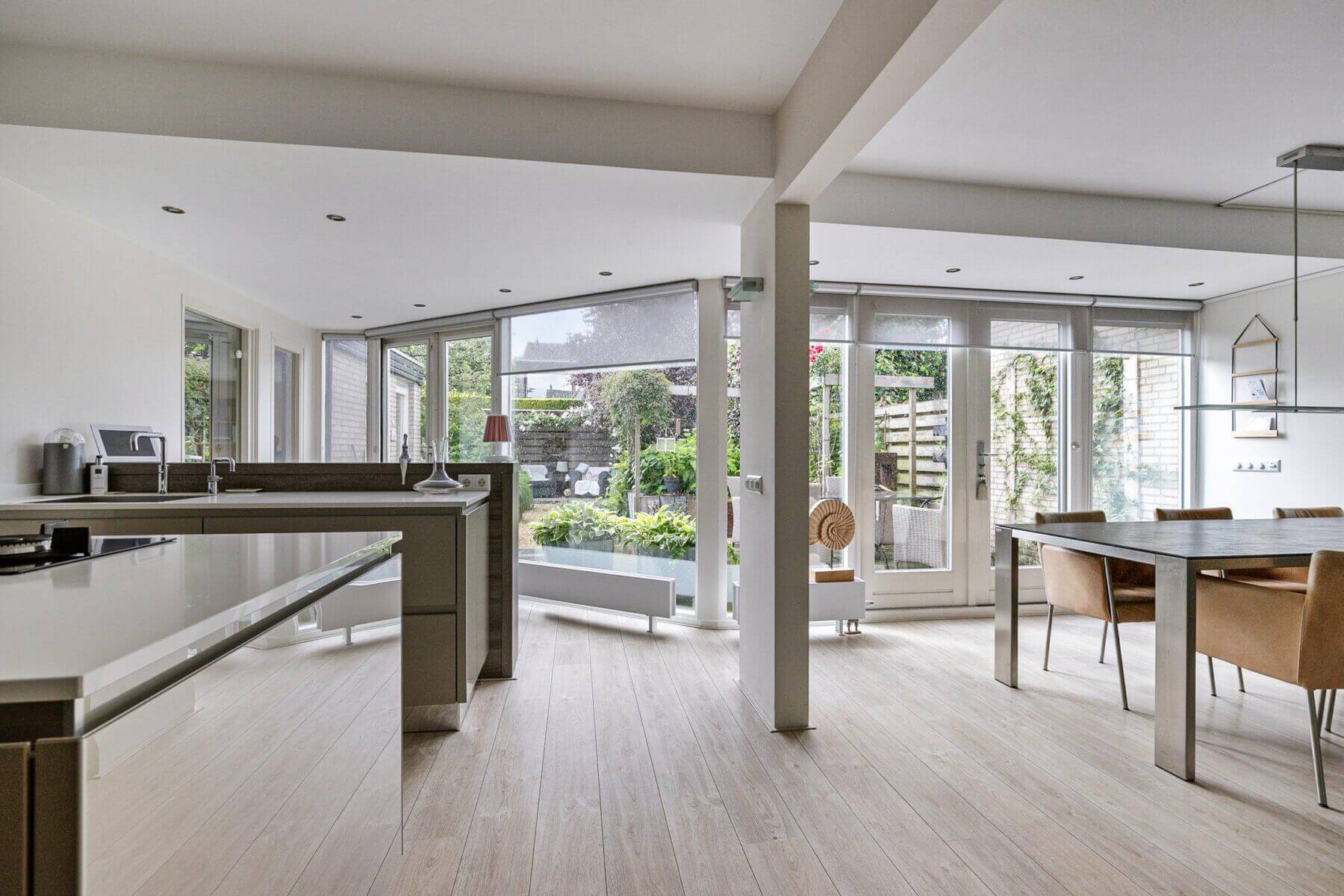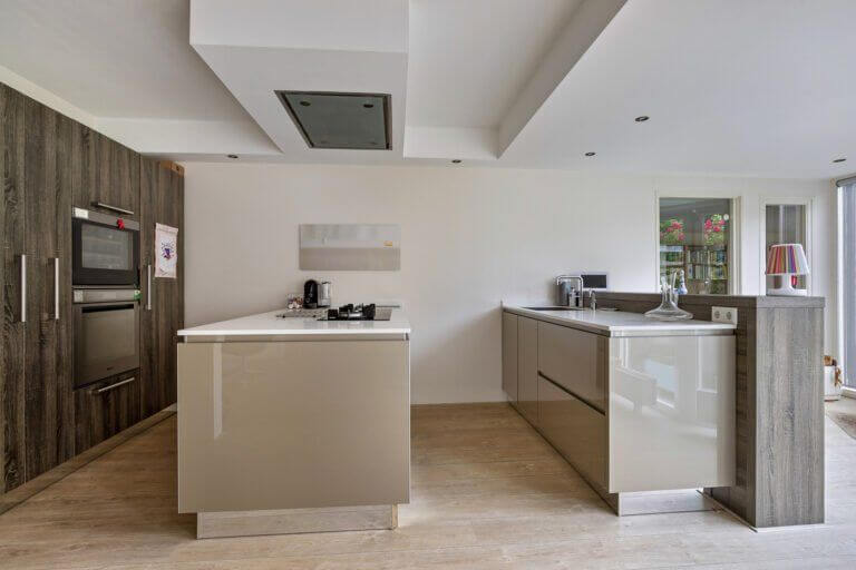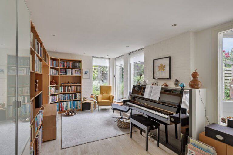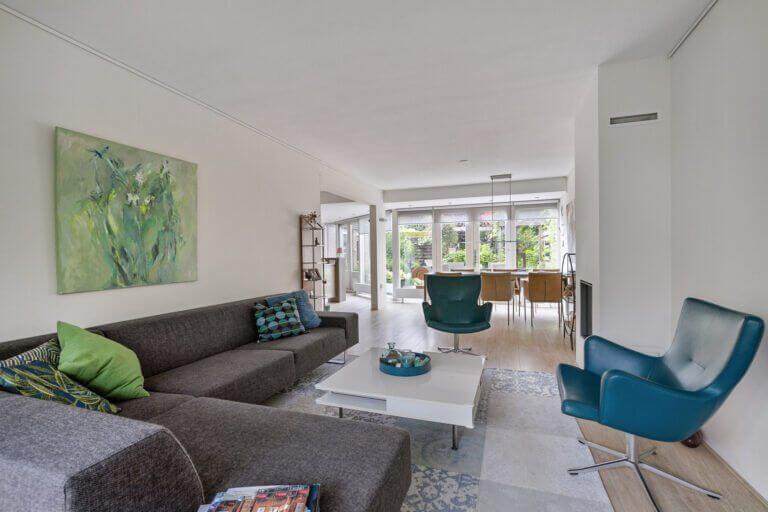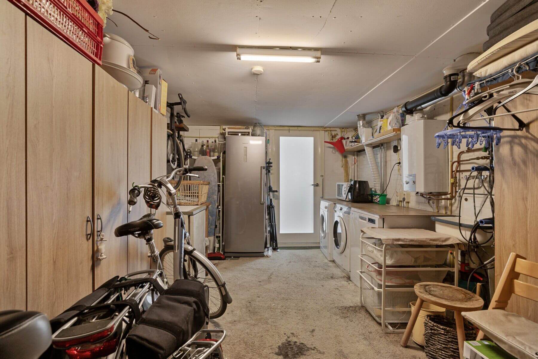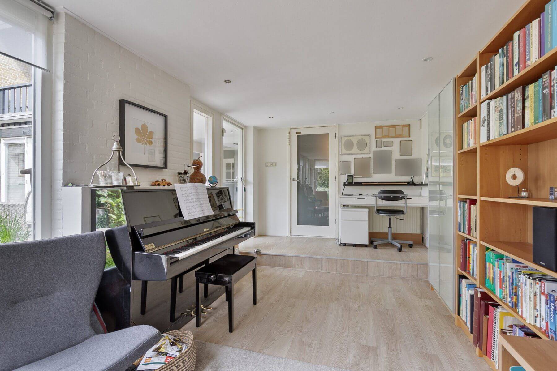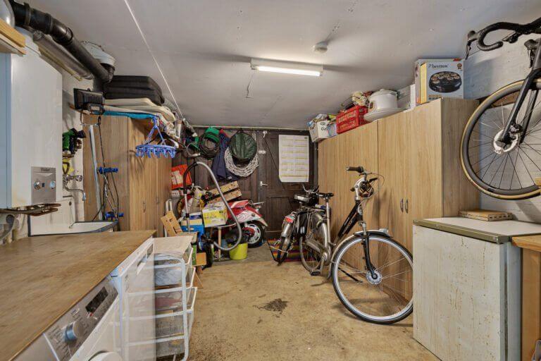 The living room and kitchen together are about 50 m² and have a beautiful laminate floor. From the kitchen, you enter the garden room (approximately 15 m²) with a workspace, a piano, and a second television. From this room, you have access to an indoor garage that is equipped with a large freezer, a washing machine, a dryer, a dishwasher, a microwave, and a second refrigerator.