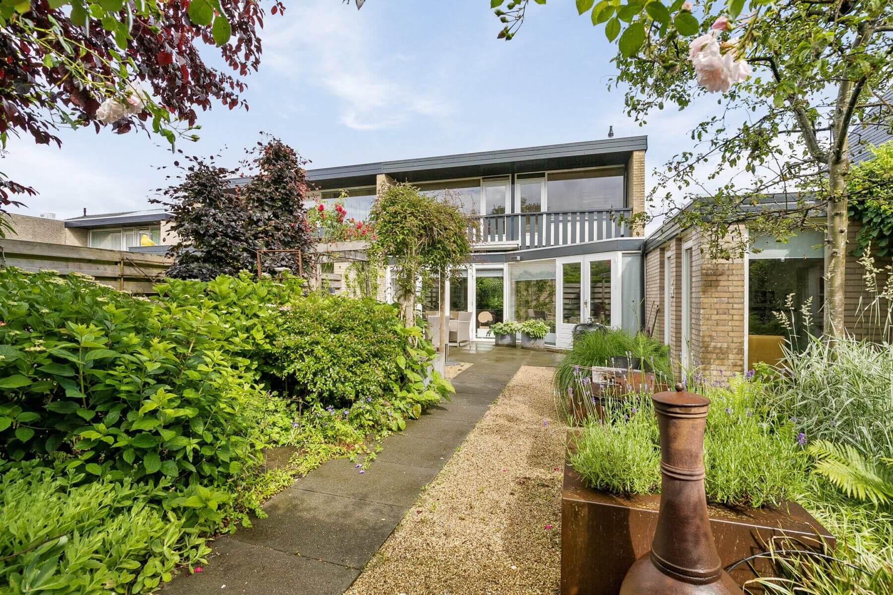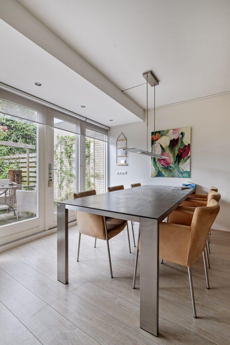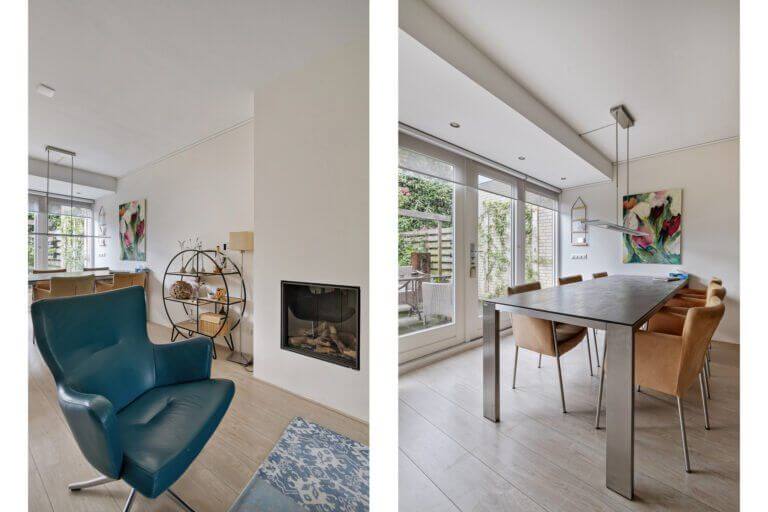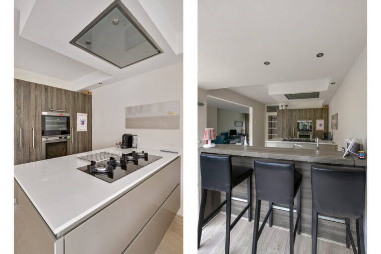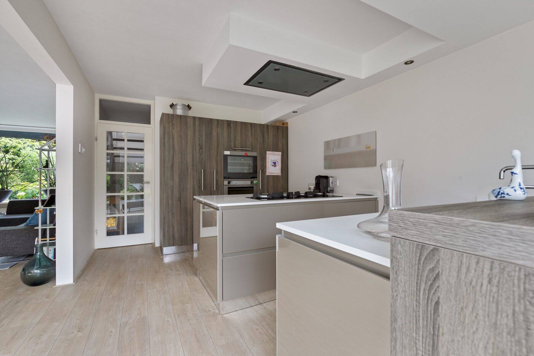 Upon entering, you step into a spacious hall with a meter cupboard/pantry, a toilet, the staircase to the upper floor, and access to the living room. The spacious living and dining area enjoy plenty of natural light and have a beautiful view of the backyard. The modern kitchen at the back is equipped with a breakfast bar, an island, a gas hob, an extractor hood, a fridge with freezer compartment, an oven/grill, a Quooker, and a wine fridge.