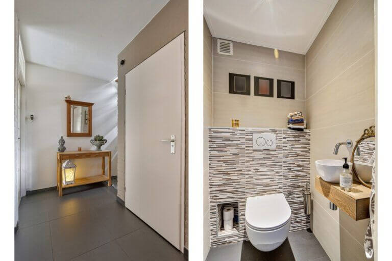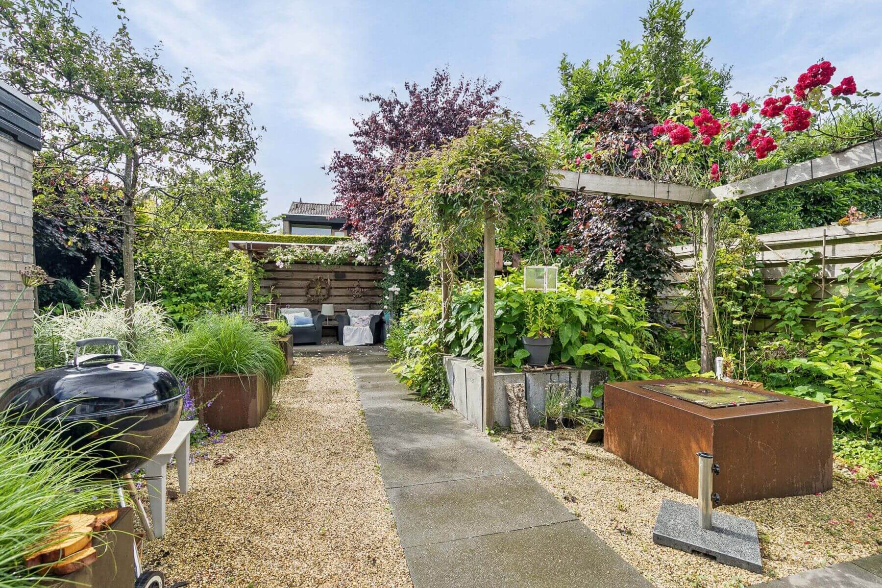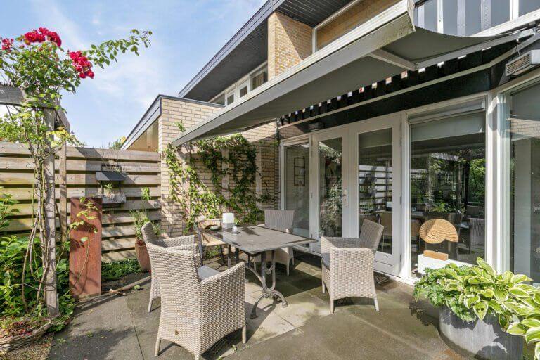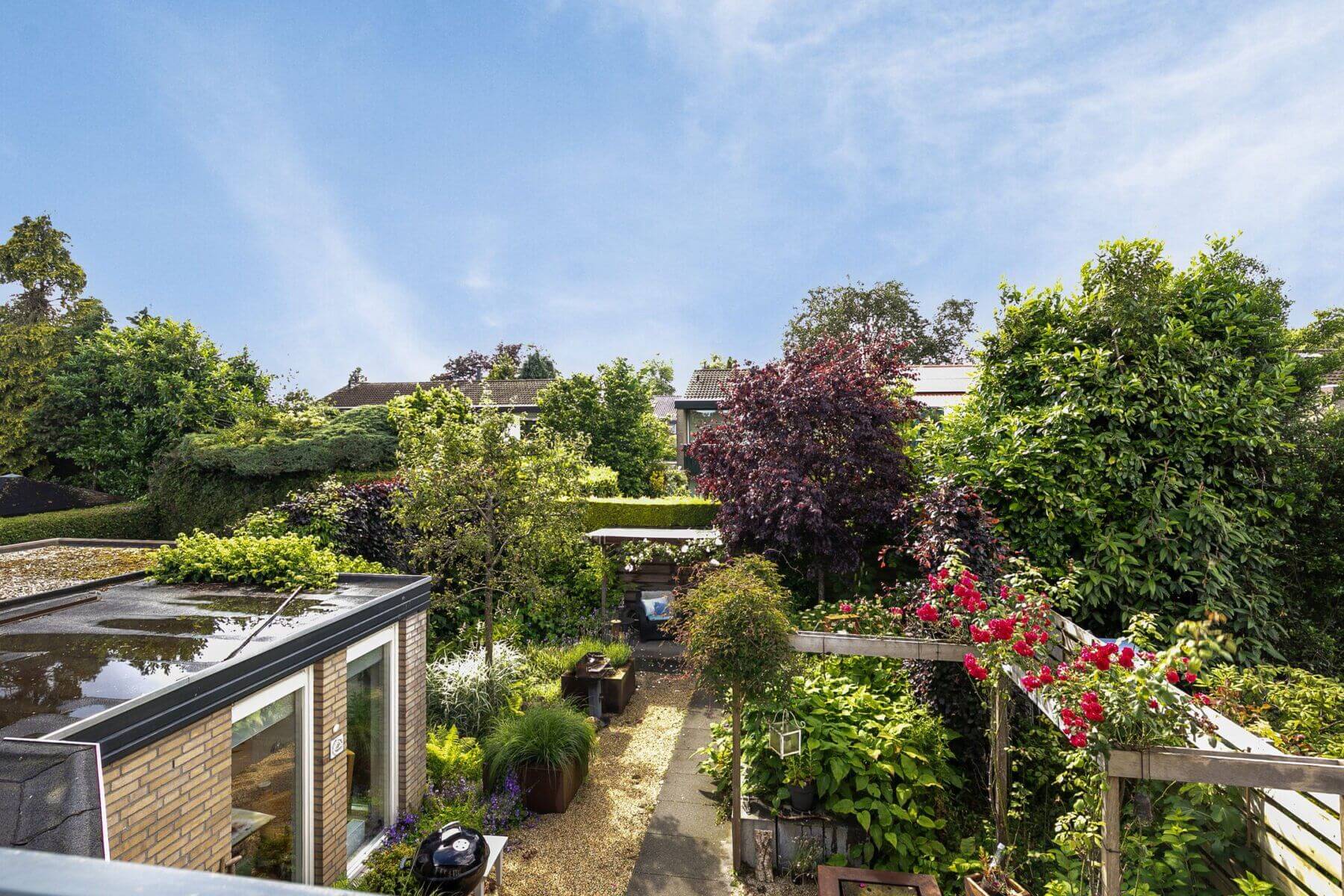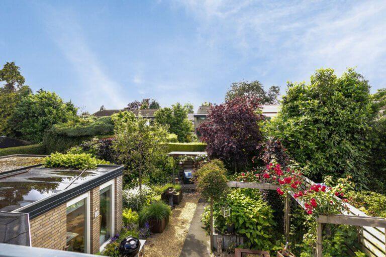 The sunny backyard facing west is about 15 meters deep and well-maintained. A gardener comes twice a year for major work, with 50% (€50 per month) charged to the tenant. The garden offers a lot of privacy. From the living room, you step onto a spacious terrace with an electrically operated awning. At the back of the garden, there is a second covered terrace.