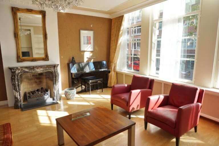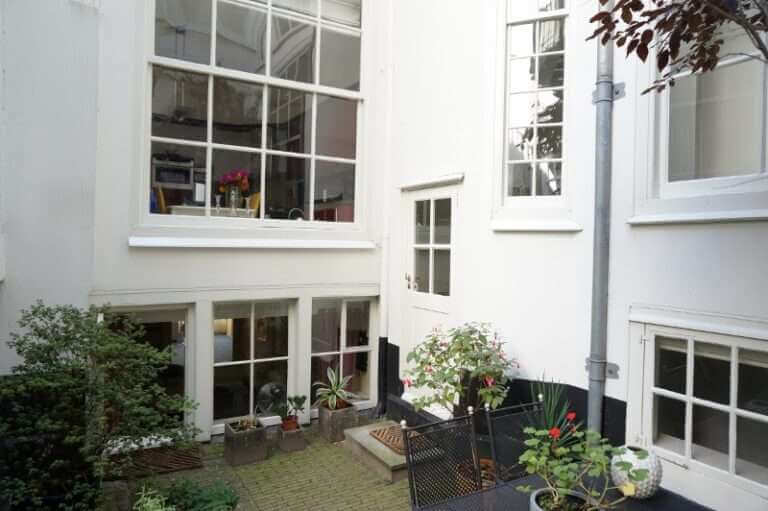 Luxurious restored canal house in a building from 1640, with 3 bedrooms, office-room, private garden and garage for two cars.