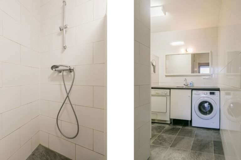 Entrance, hall with access to meter cupboard, bathroom with toilet and fountain, spacious bedroom with closet, neat bathroom with walk-in shower, sink and mirror, including the washer and dryer, storage room with central heating boiler and living room.