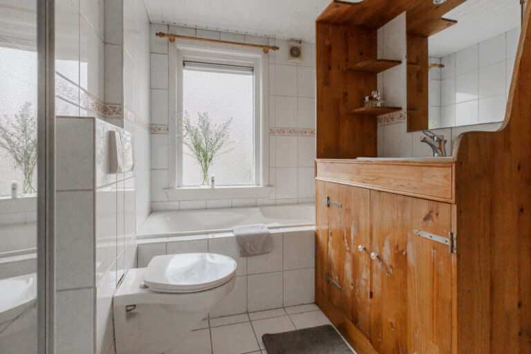 – Bathroom with bathtub, toilet and separate shower.