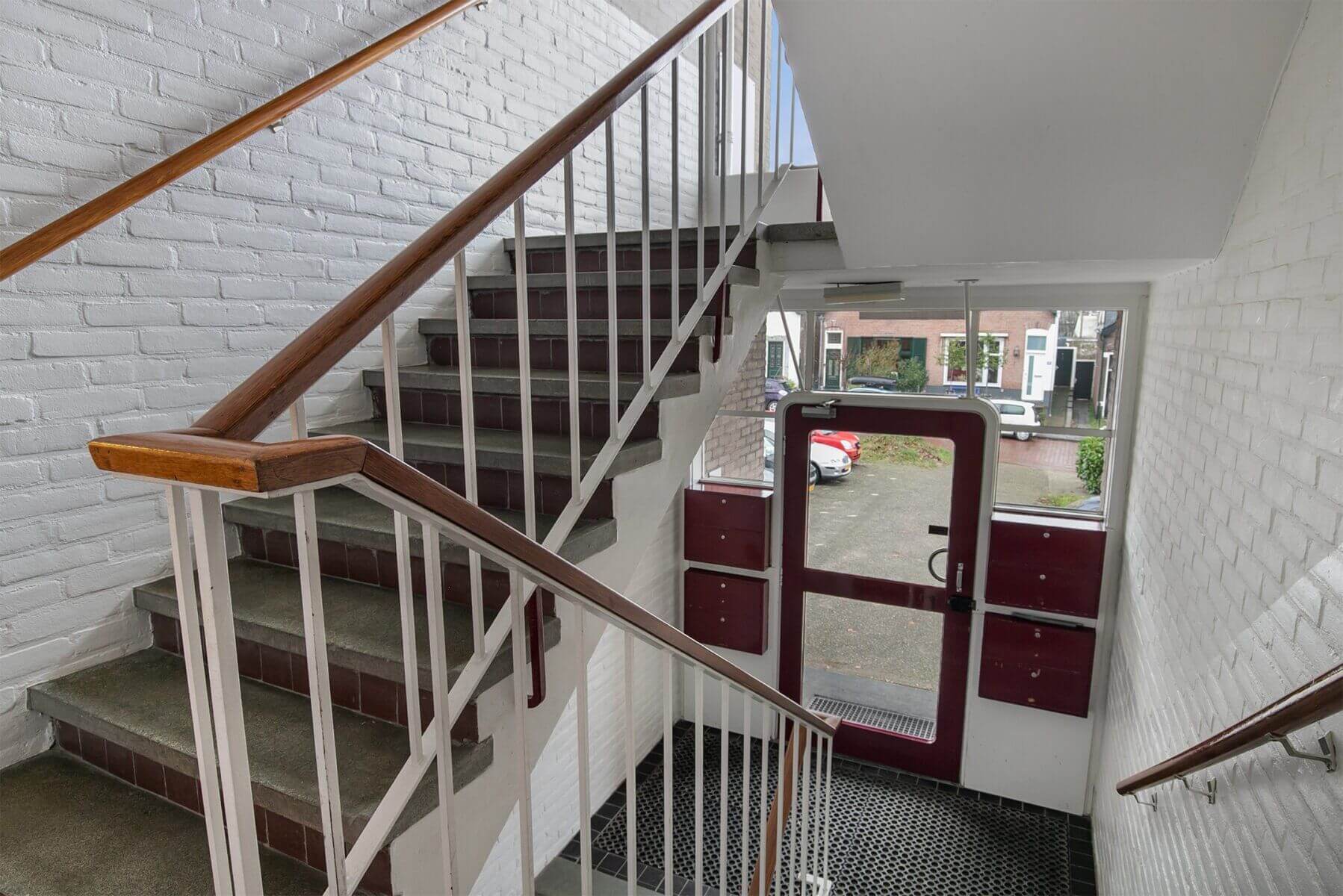 central entrance with letterboxes, access to storage rooms and stairs to upper floors.