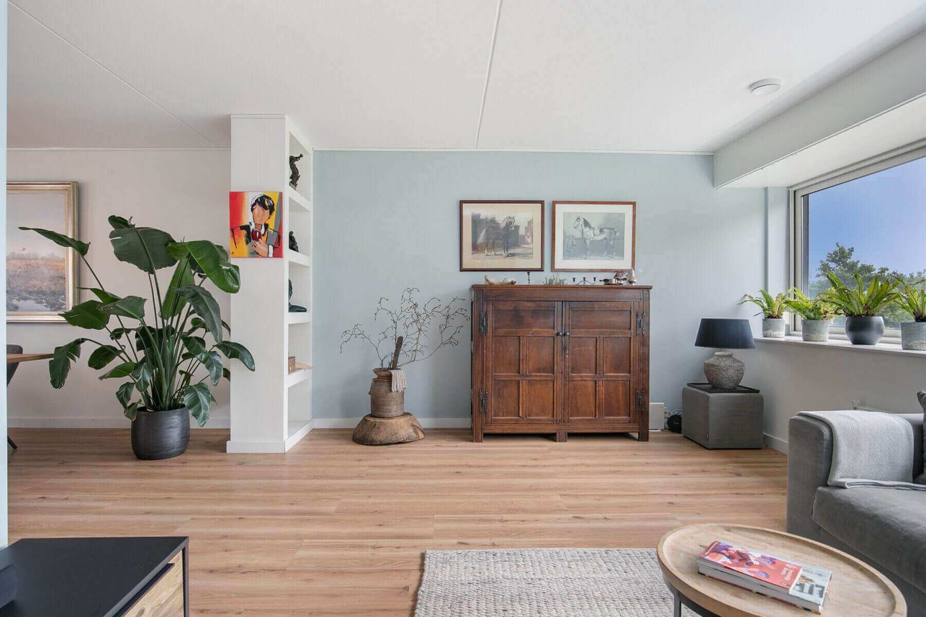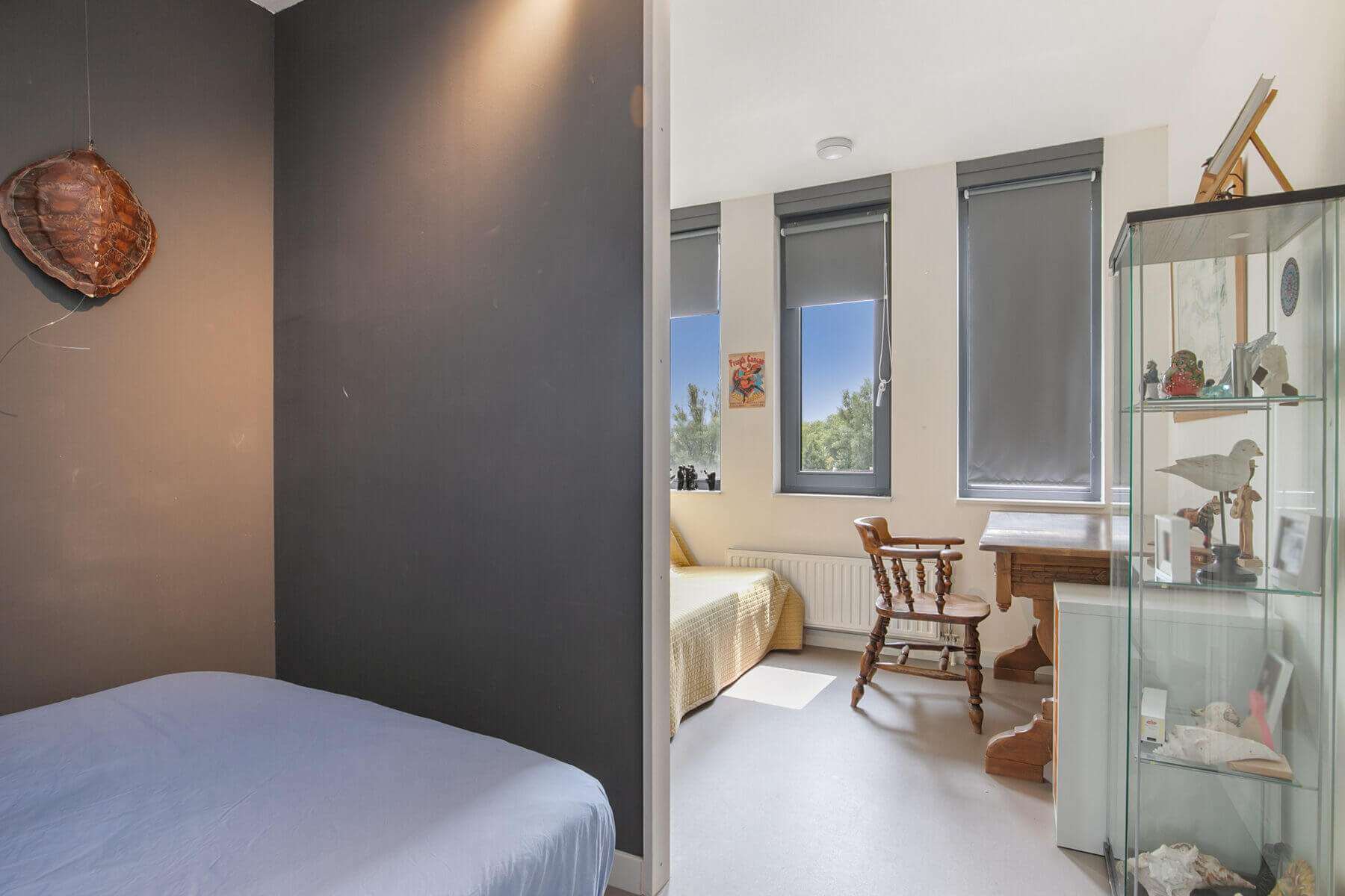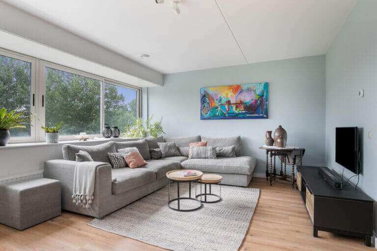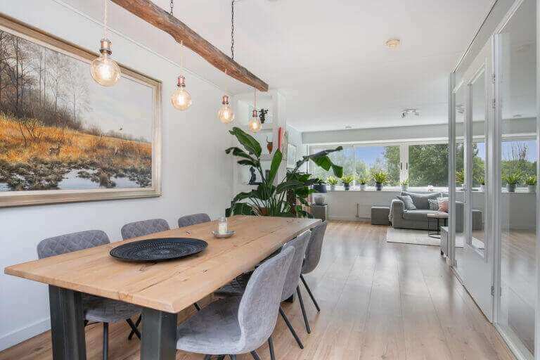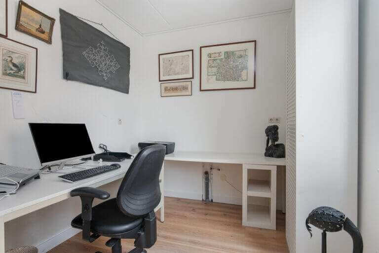A fixed staircase leads to the landing with access to the spacious living room (total with the office over 46m²). The bright living room is characterized by excellent daylight entry and is equipped with a beautiful panoramic window and beautiful laminate flooring.