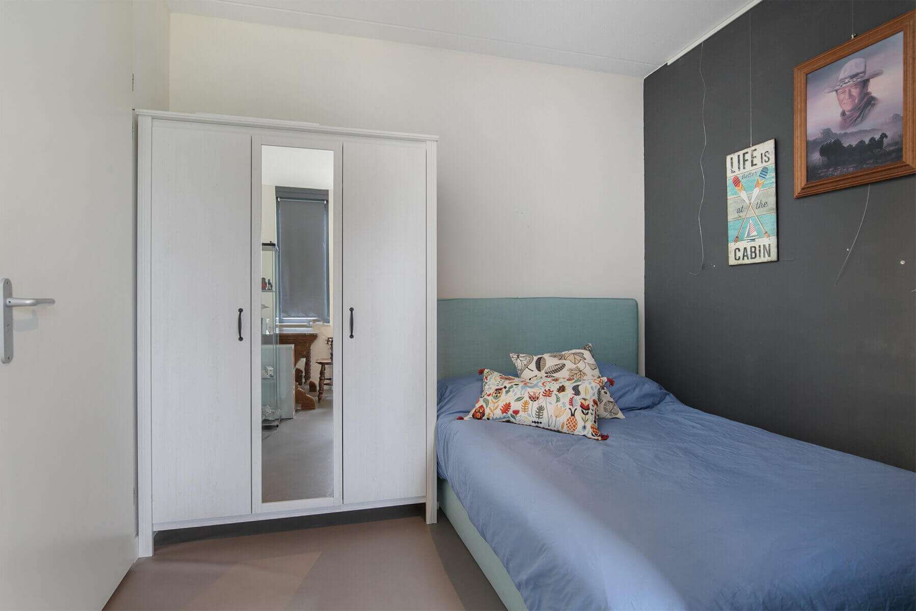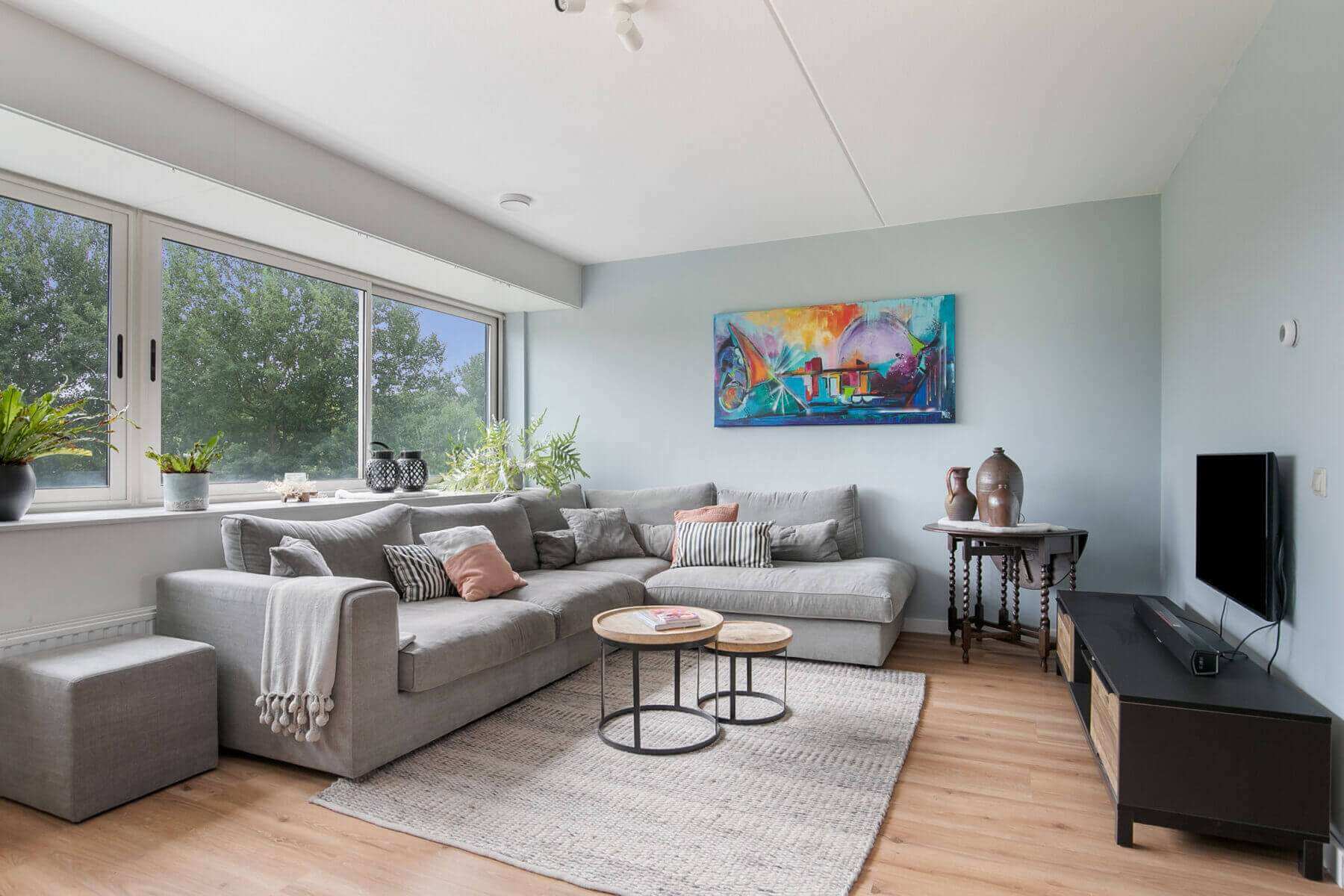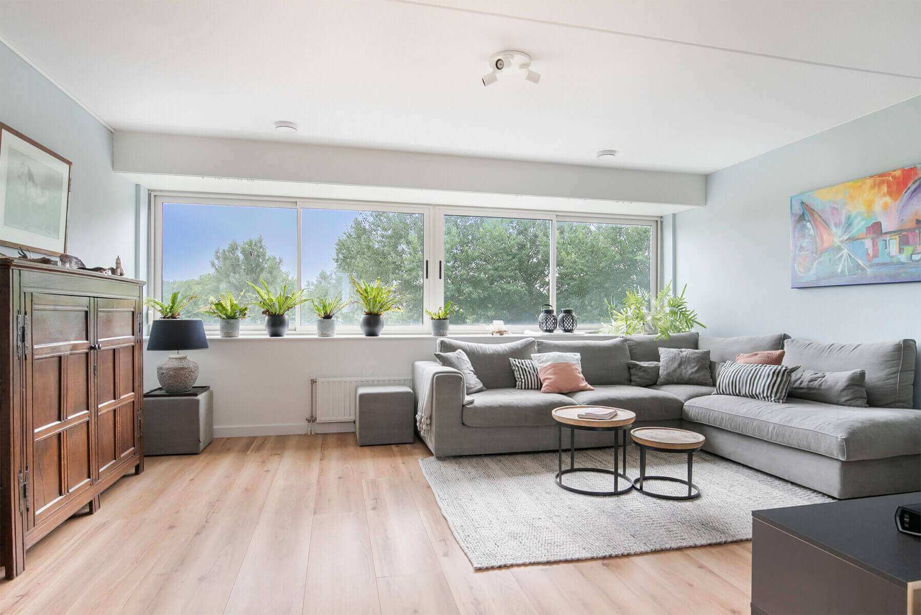 A fixed staircase leads to the landing with access to the spacious living room (total with the office over 46m²). The bright living room is characterized by excellent daylight entry and is equipped with a beautiful panoramic window and beautiful laminate flooring.