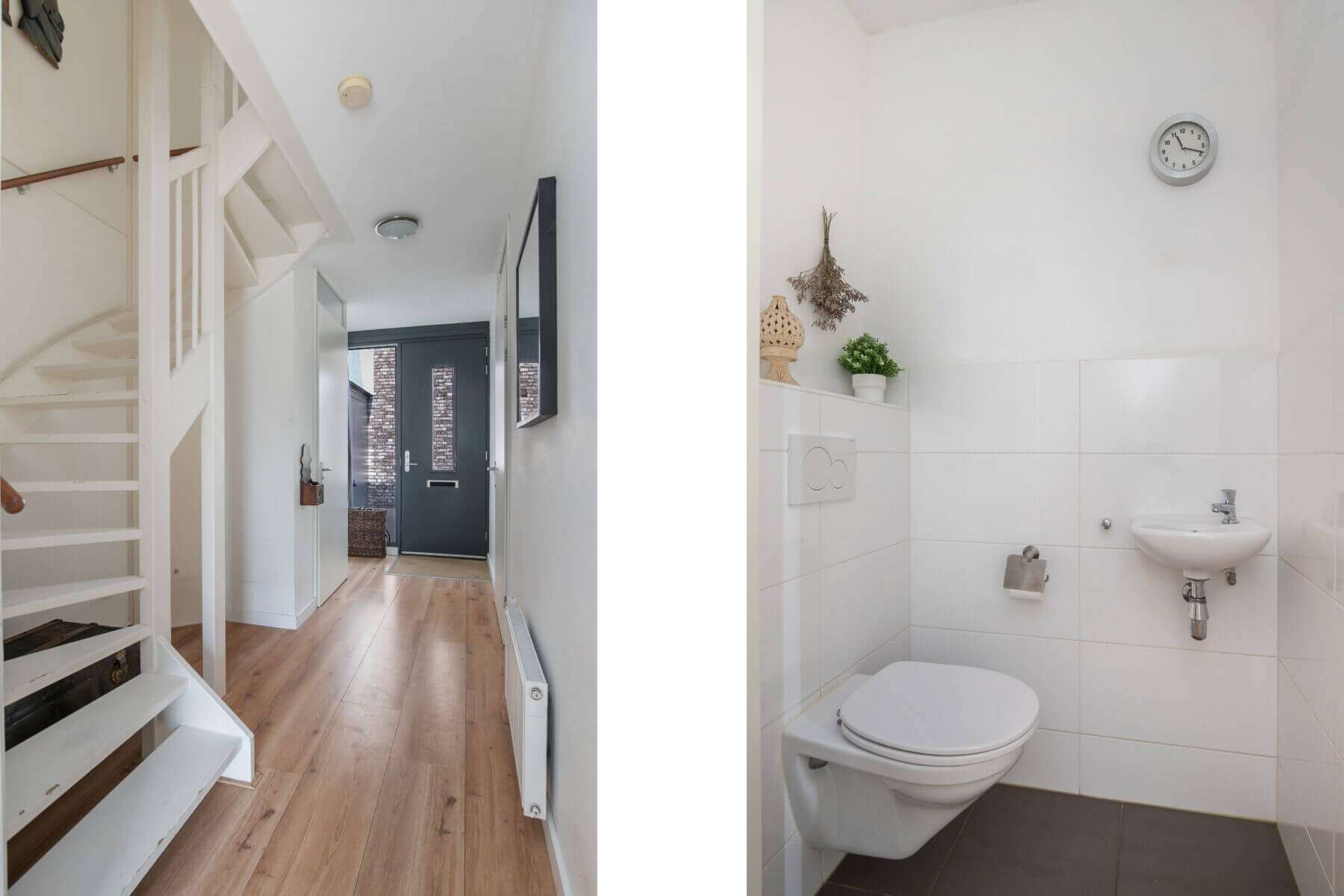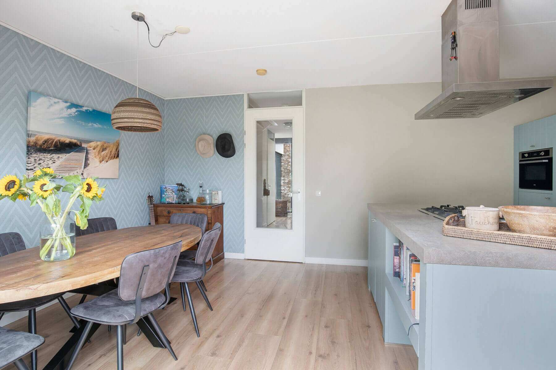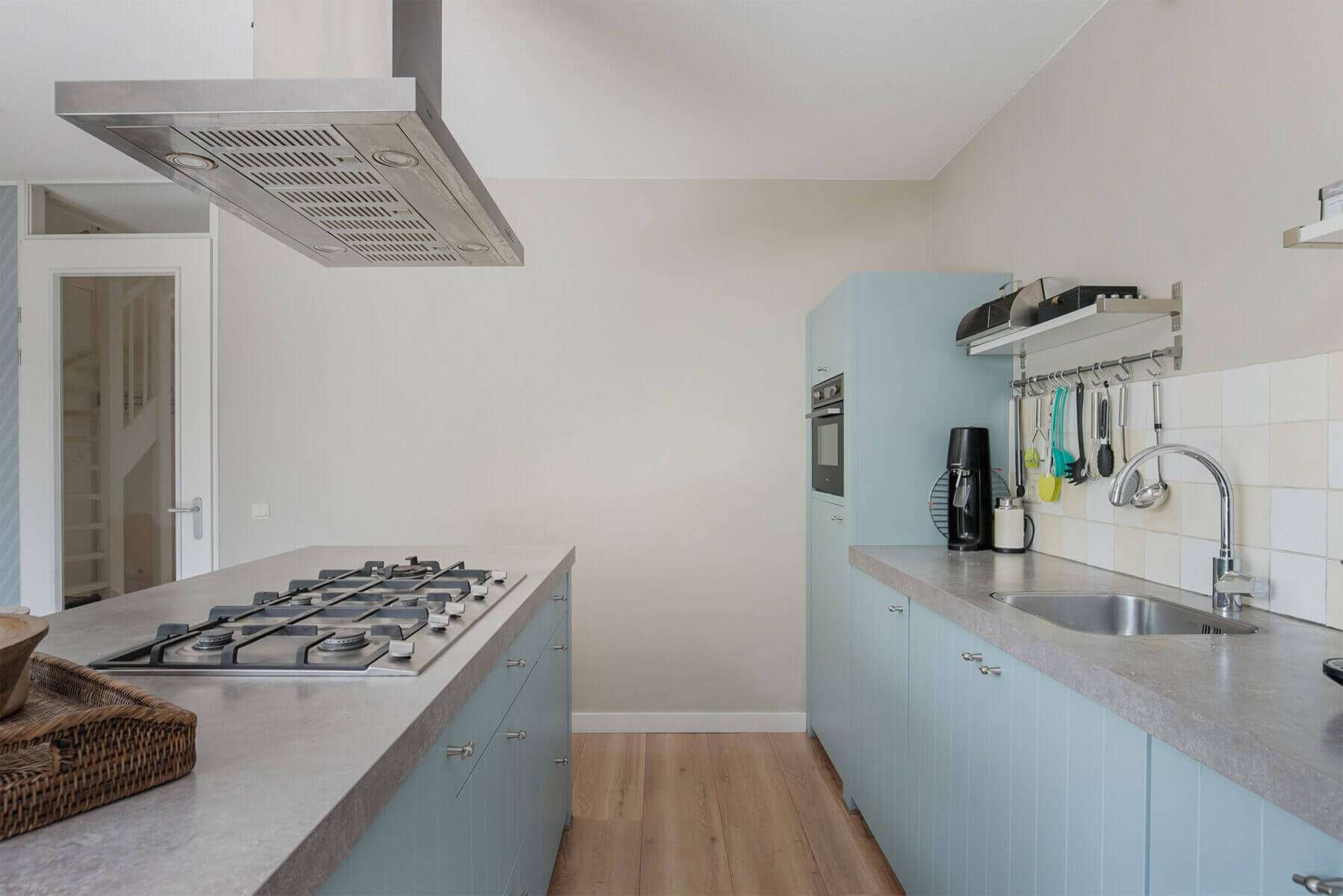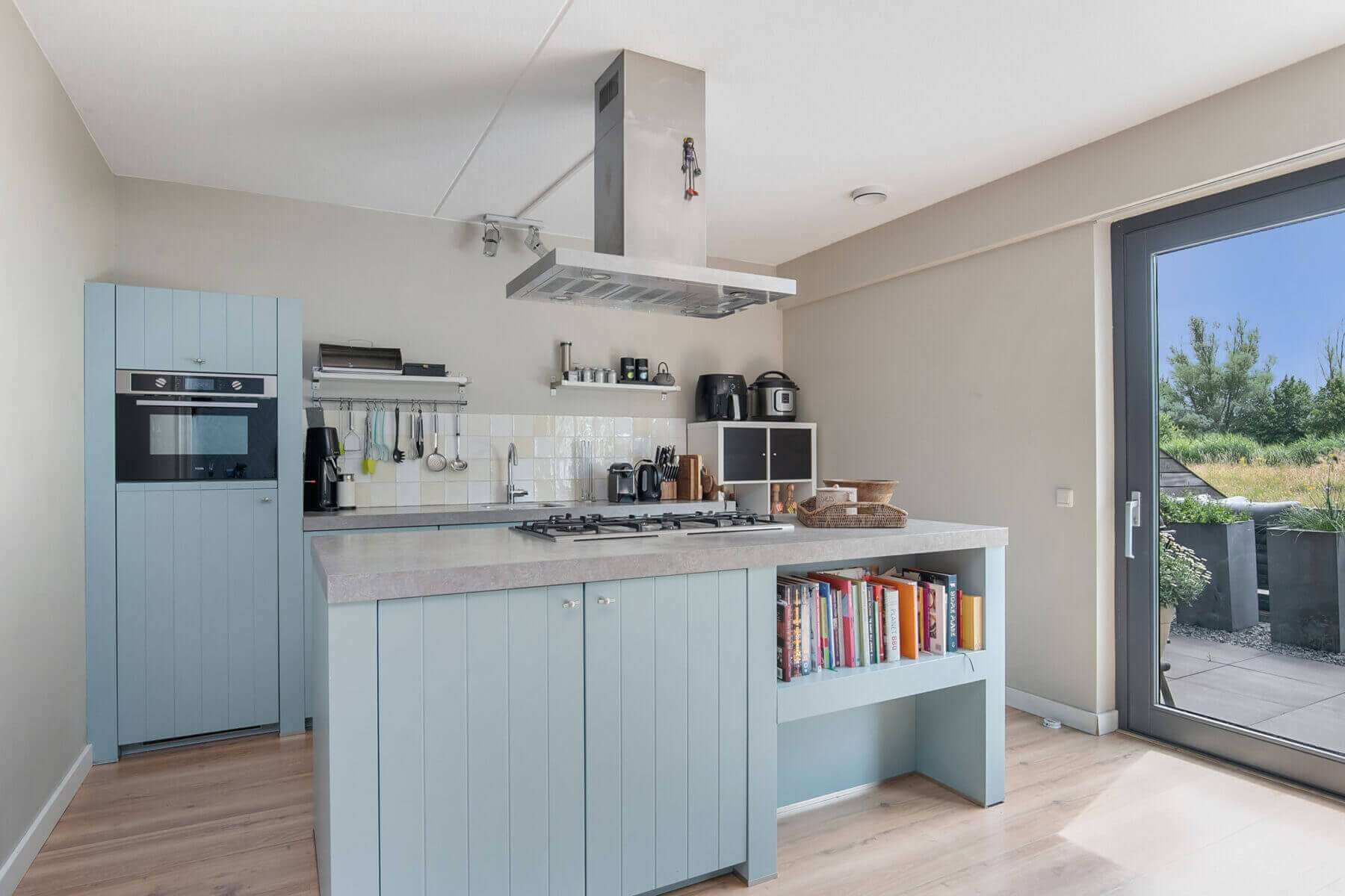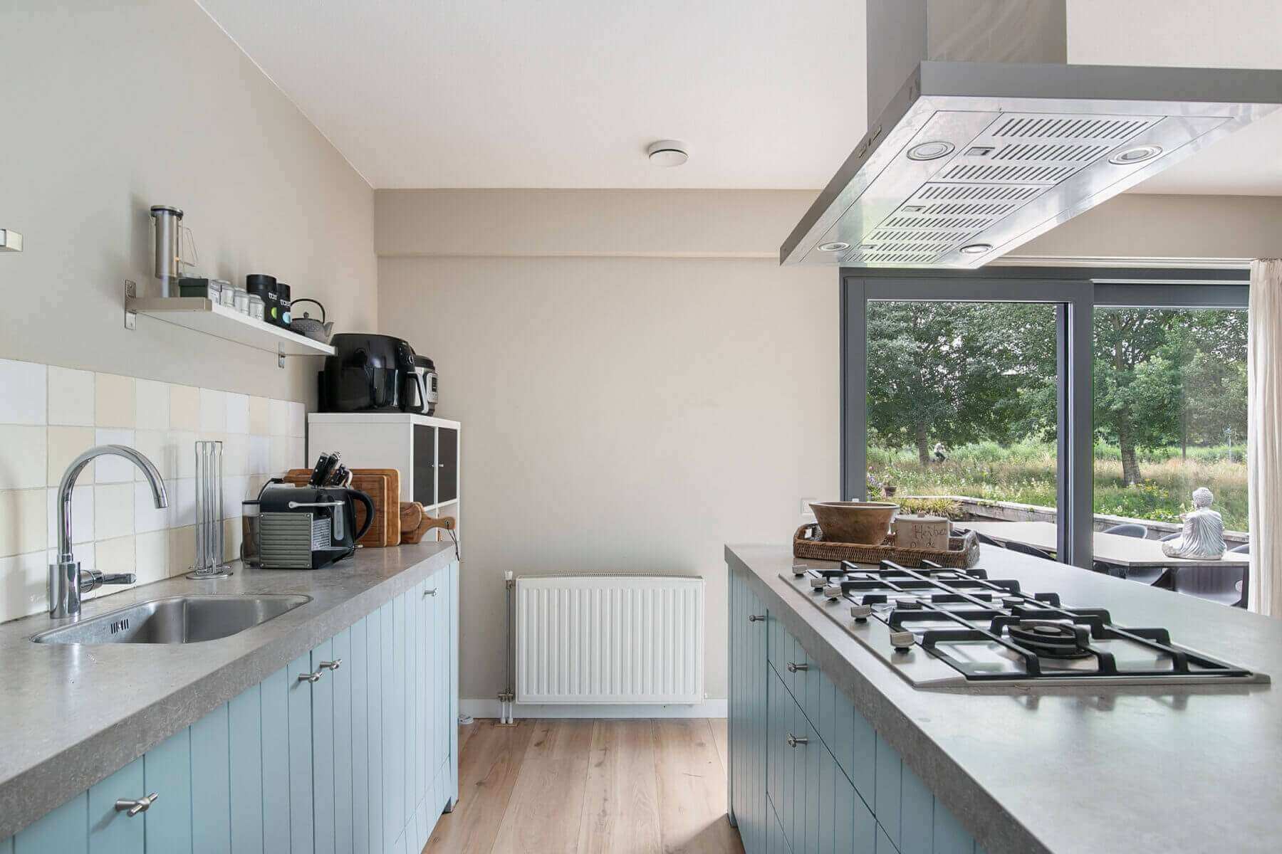 Hallway/entrance with stairs to the 1st floor, meter cupboard, cloakroom and access to modern tiled toilet room with wall-hung toilet and sink and access to the multifunctional kitchen (approx. 3.91 x 3.37m) with sliding doors to the sunny backyard with terrace. The kitchen is fully equipped with a cooking peninsula, 5-burner hob, extractor hood, dishwasher, refrigerator, combi oven, various drawers and base cabinets.