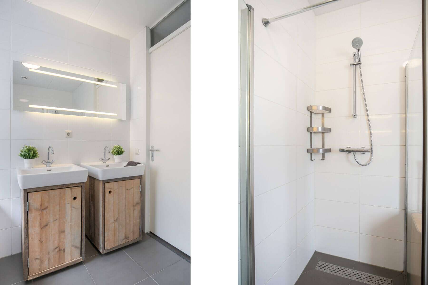 Landing with access to the modern, fully tiled bathroom (approx. 2.45 x 2.69 m.) with bath, separate shower, double sink and 2nd wall closet.