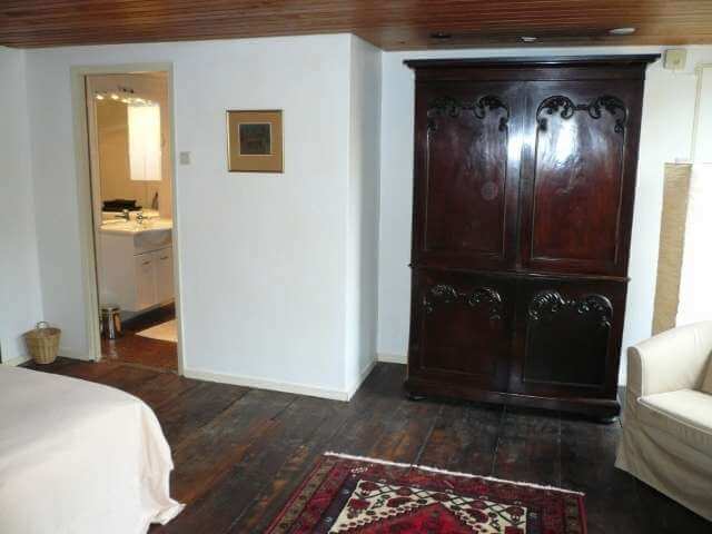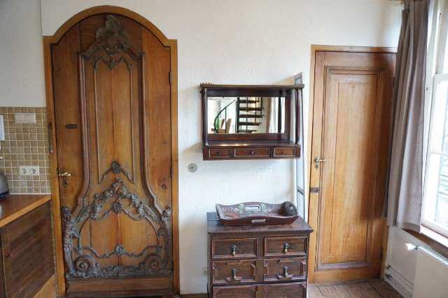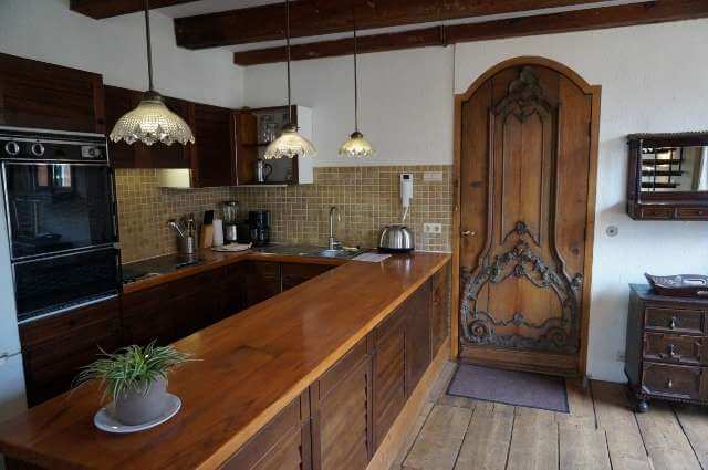 Through the private stairs you reach the apartment on the first floor. In the hall is a separate toilet and access to the complete kitchen in the old style and spacious living room with fireplace.