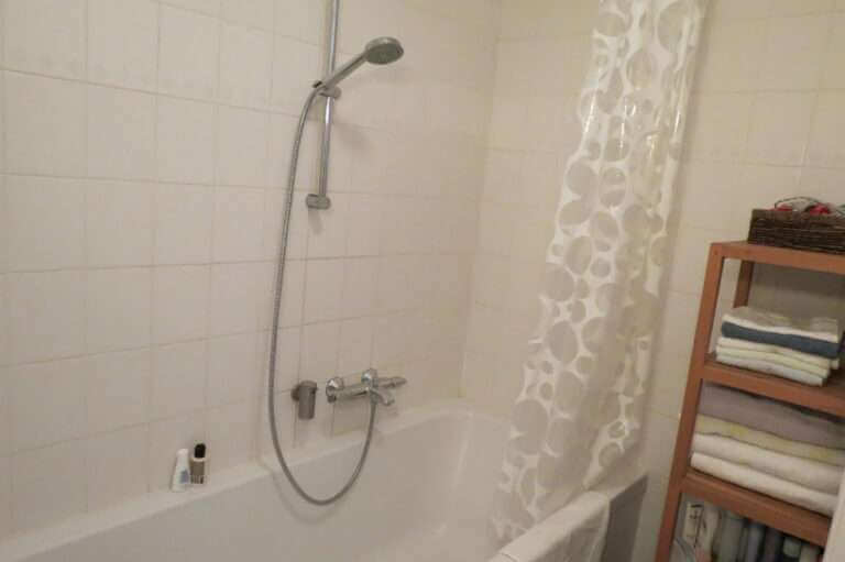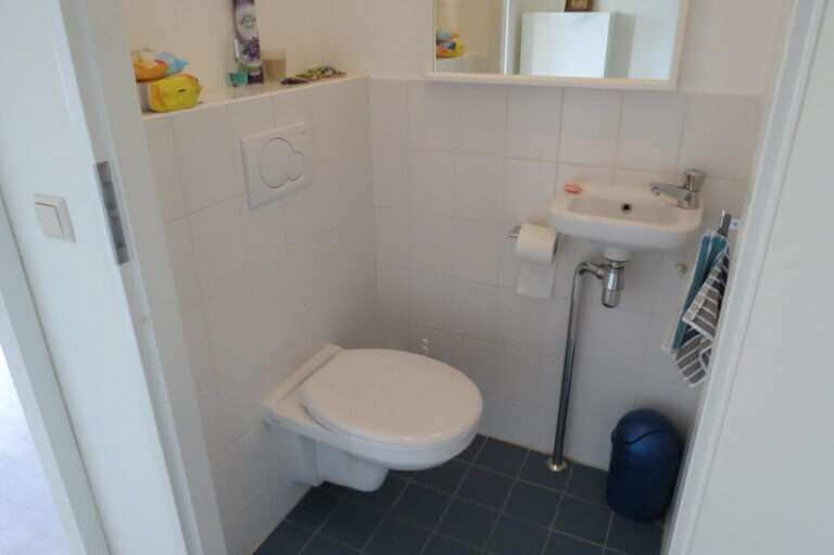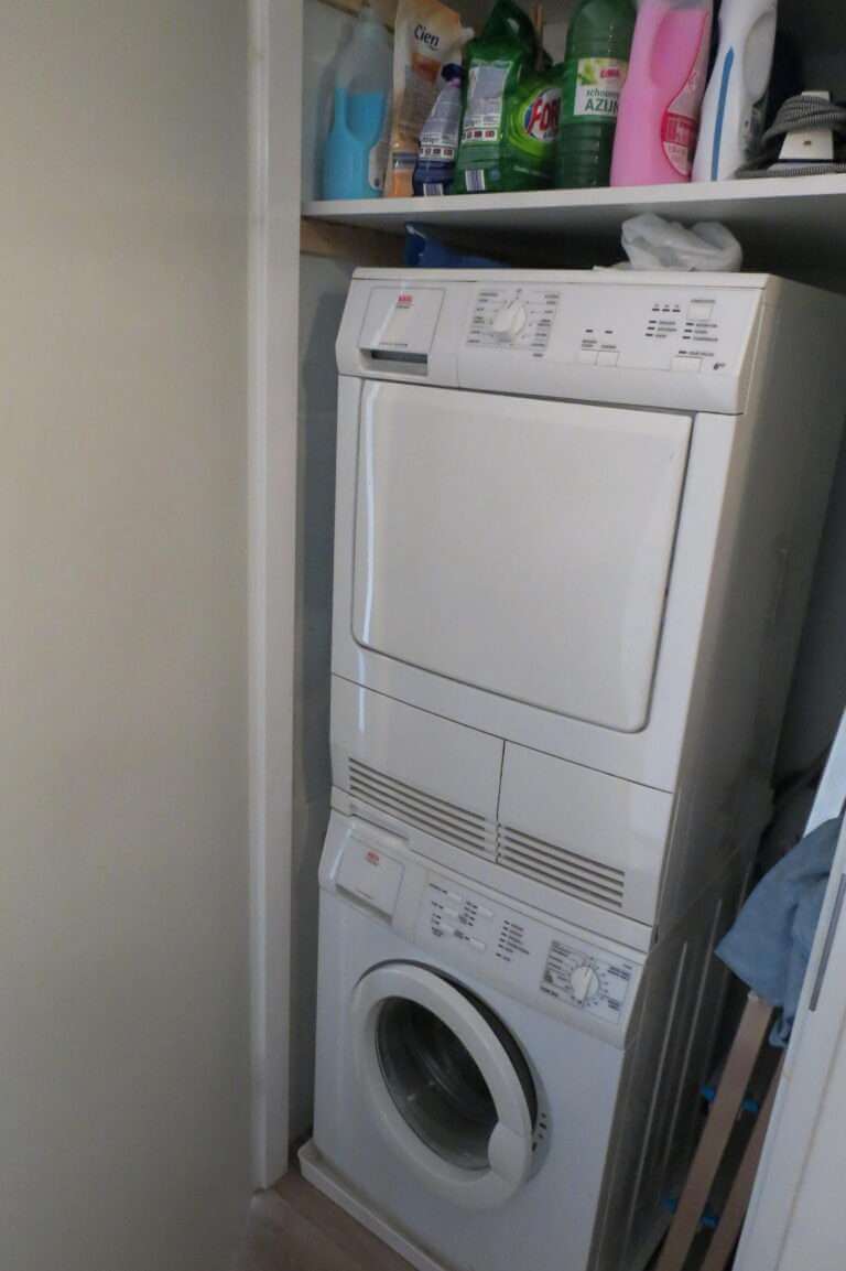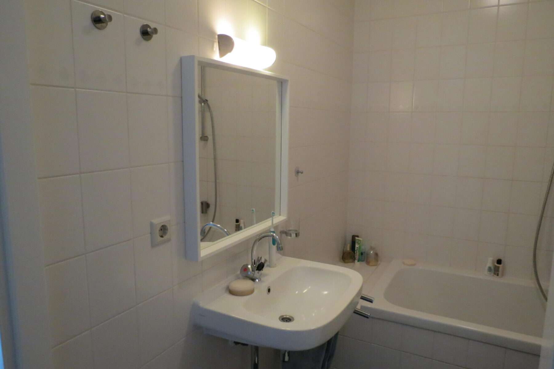 The entrance gives access to the spacious bedroom, a separate toilet with hand basin and a closet containing a washing machine and tumble dryer. The bathroom has a sink, a bathtub and a shower.