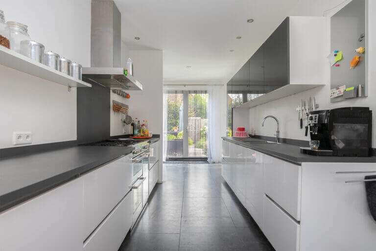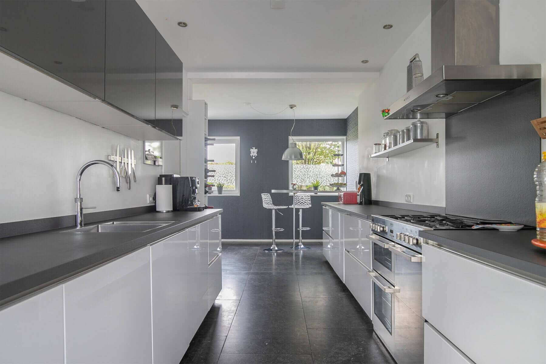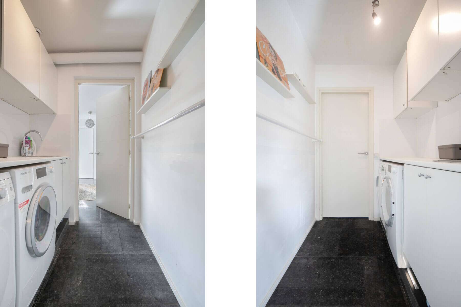 Entrance, separate toilet. Spacious living room, dining room and semi-open kitchen. The kitchen is equipped with no less than 3 ovens, a combination microwave, Quooker, 2 refrigerators, dishwasher, electrical burners and extractor hood. There is also a dining bar. Adjacent to the kitchen is a pantry. Here you’ll find plenty of storage and also an additional large freezer. If you need more room for storage, you can walk over to the laundry room, which has a washing machine, dryer and more storage space.