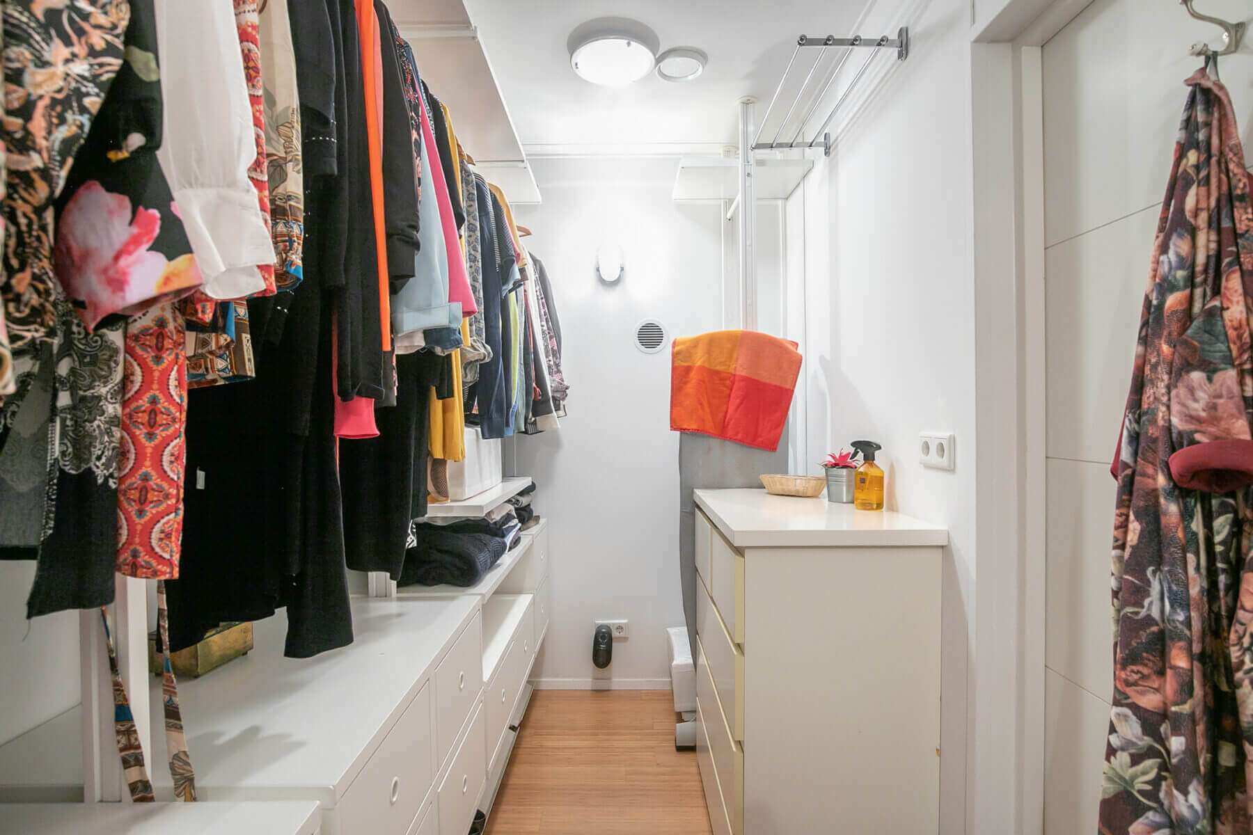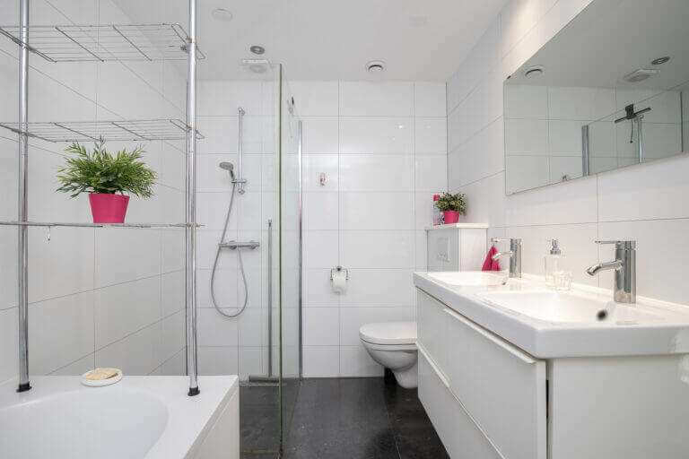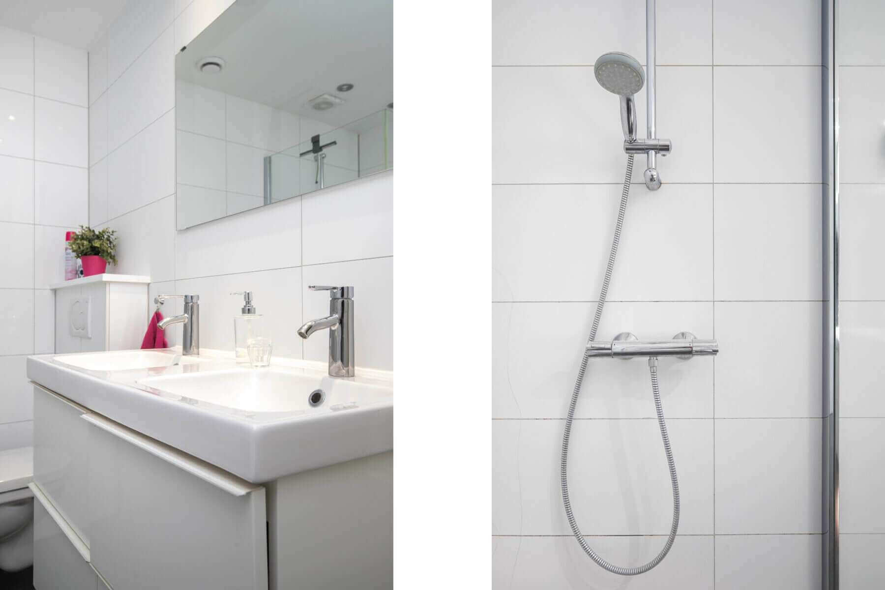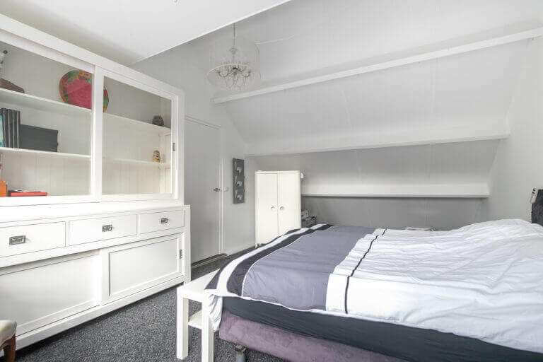 Also on the ground floor is one of the bedrooms, bathroom and walk-in closet. From the charming bedroom you can enter the garden through the French door. The bathroom is equipped with a double sink, bath, toilet, walk-in shower and build-in storage.