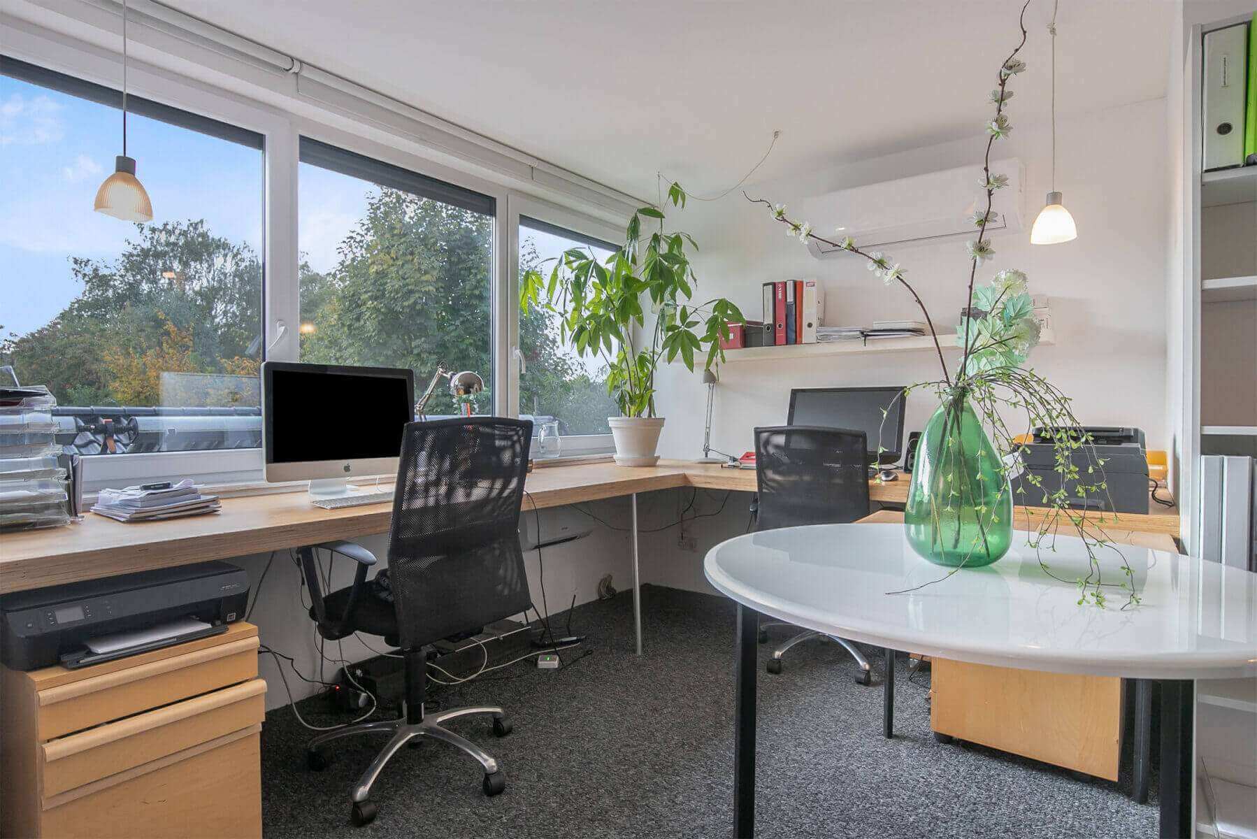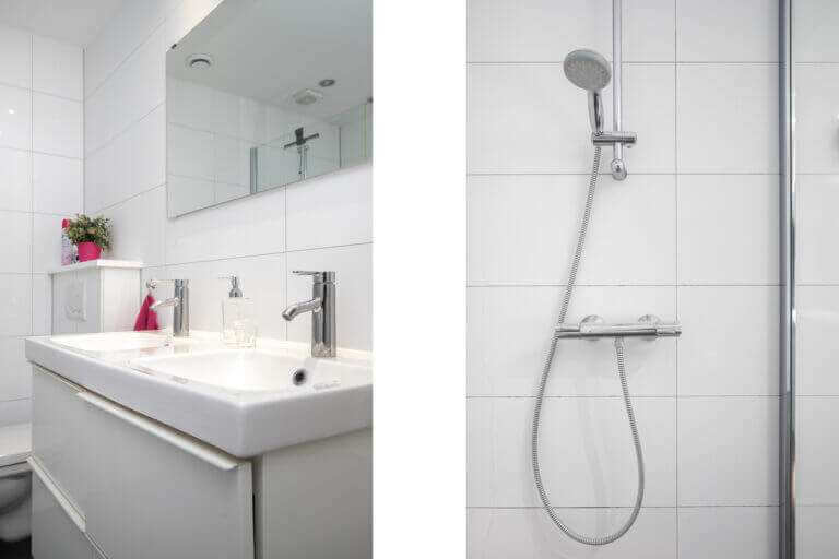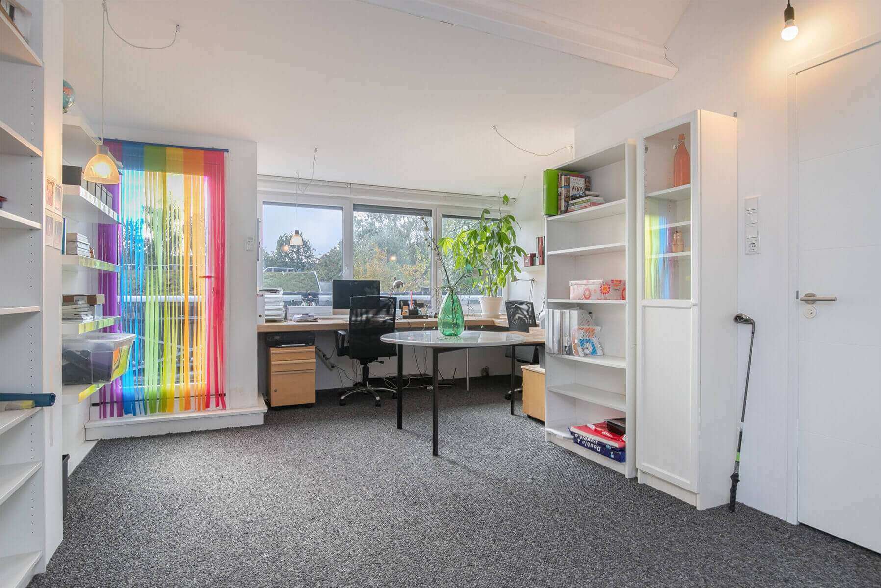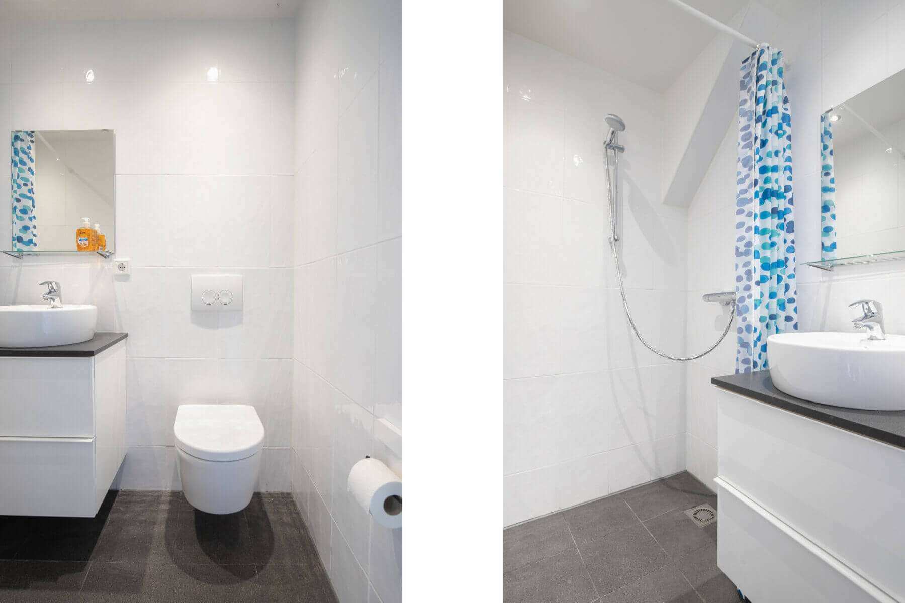 On the first floor is the second bedroom, large home office – equipped for 2 people – and the second bathroom. This bathroom has a walk-in shower, sink and toilet.