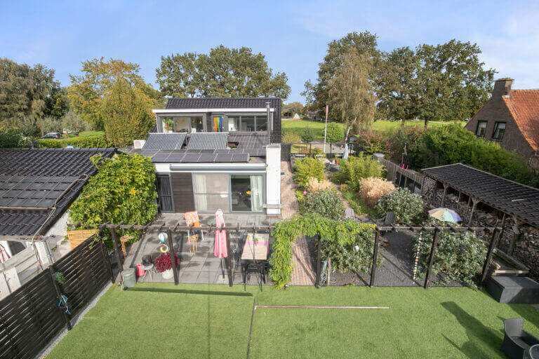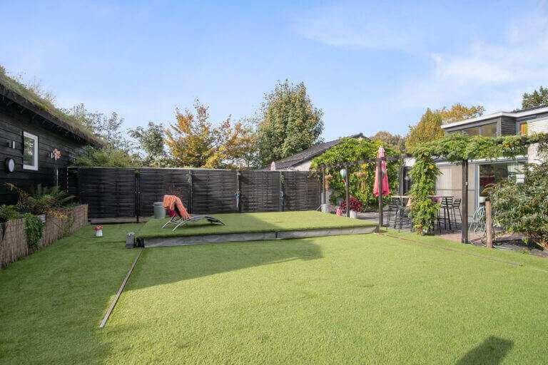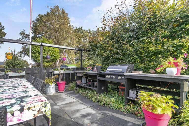 The very spacious garden can be entered through the sliding doors from the living room or through the bedroom on the ground floor. The garden is all around and has several places where you can sit and enjoy the peace and quiet. There is a spacious terrace with barbecue, a fire pit and an outdoor kitchen with water connection and sink.