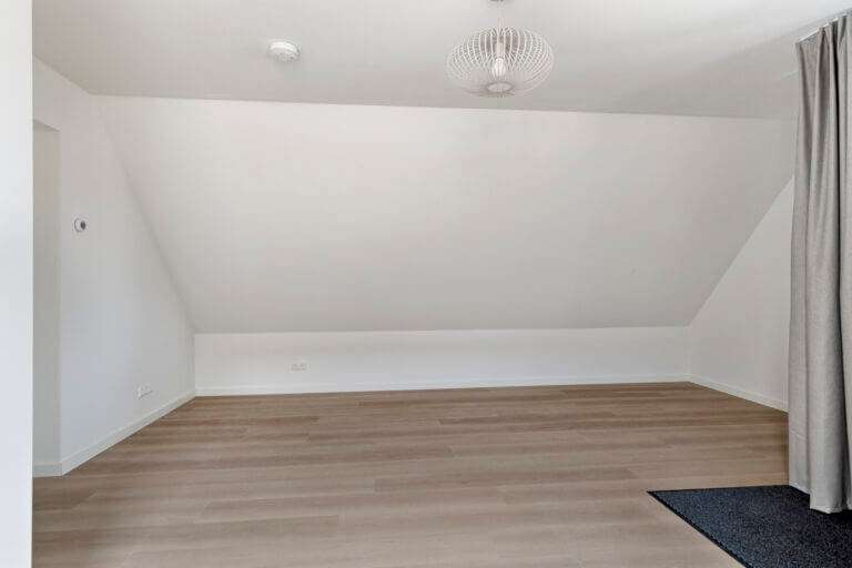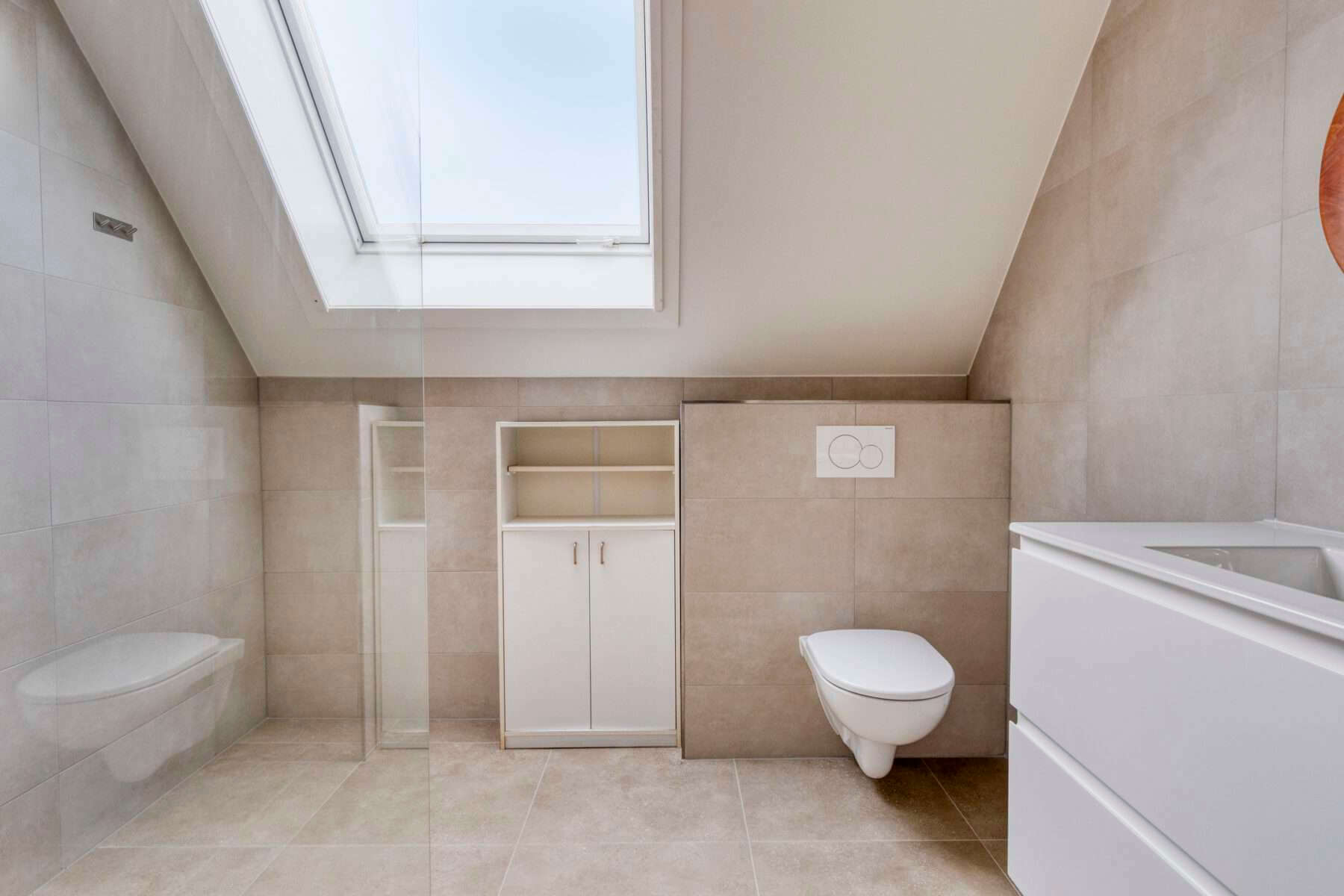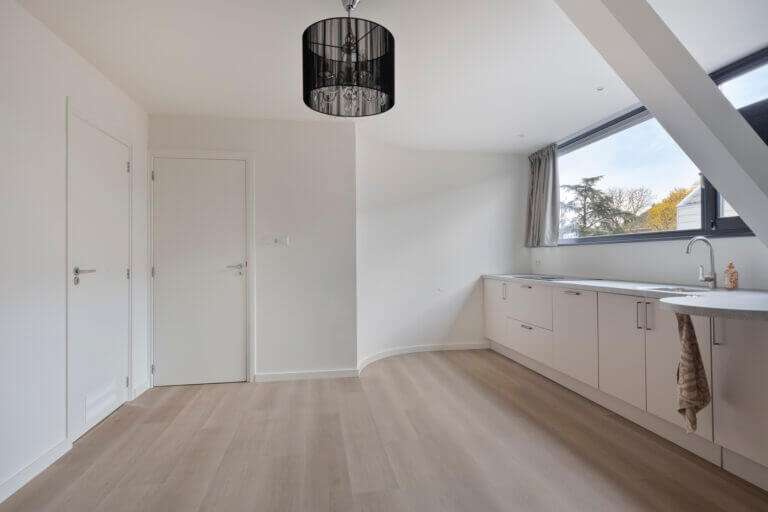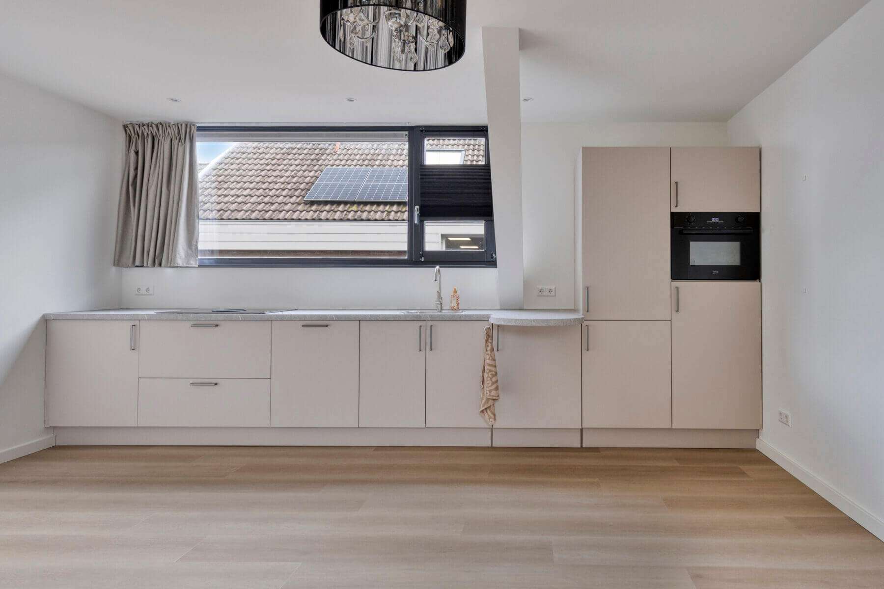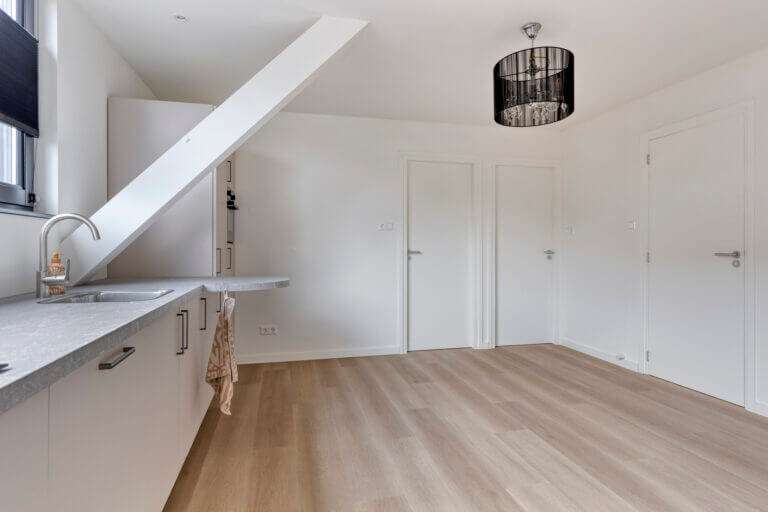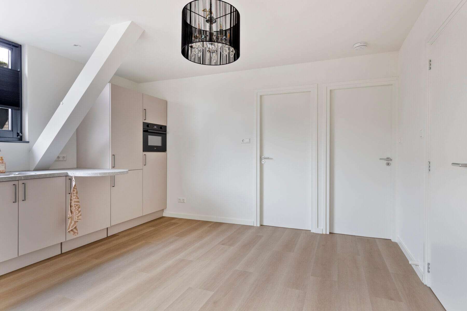 The playful living room is located at the front of the flat and offers many layout options. From the living room, you have direct access to the large and bright kitchen, which is the heart of this flat. The spacious kitchen includes a fridge-freezer, induction hob with extractor fan and a dishwasher. Both bedrooms and the bathroom are accessible from the kitchen. The bathroom has a washbasin, walk-in shower and wall-mounted toilet.