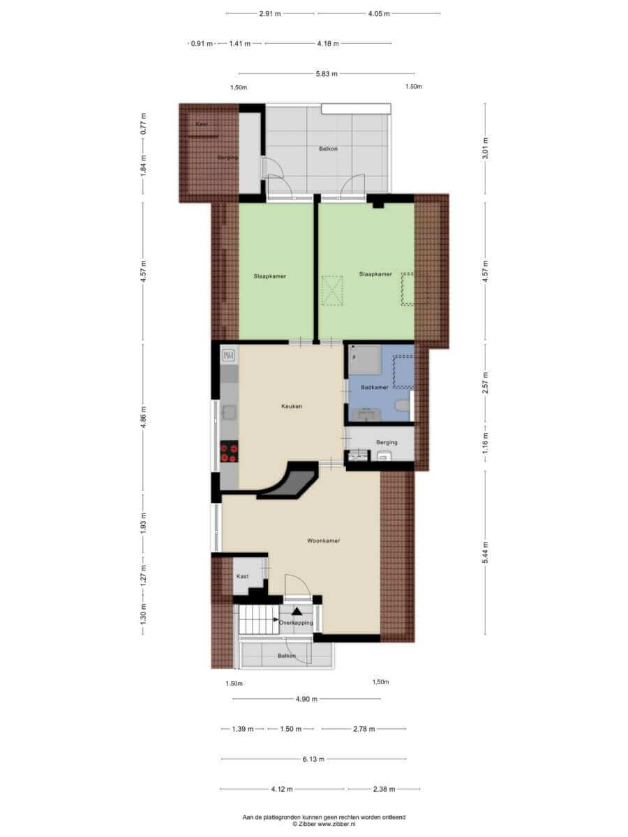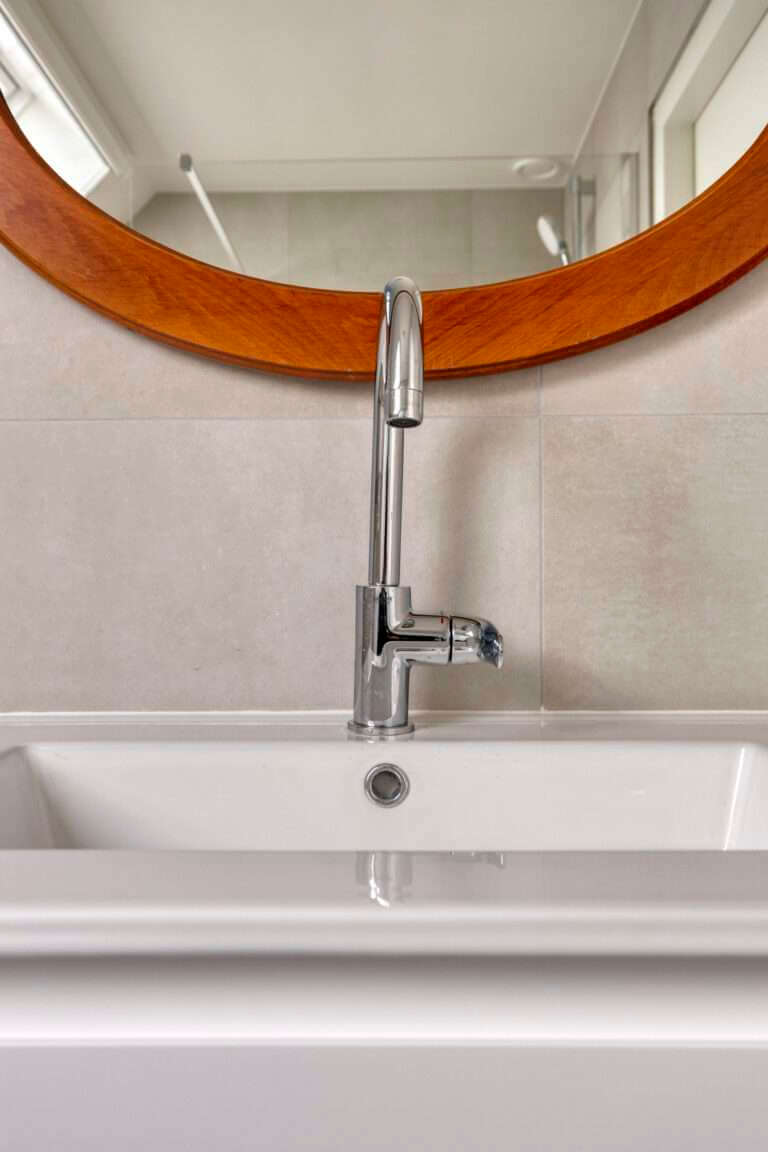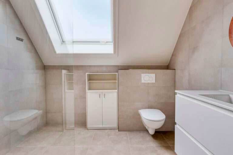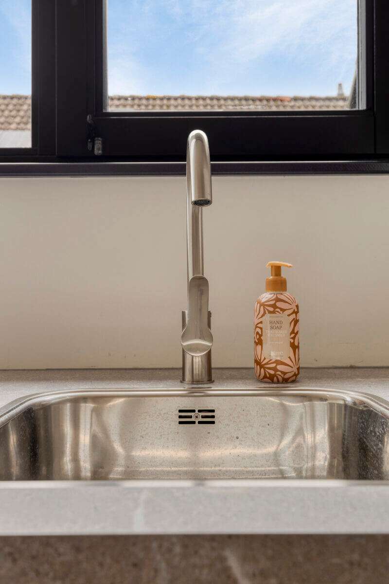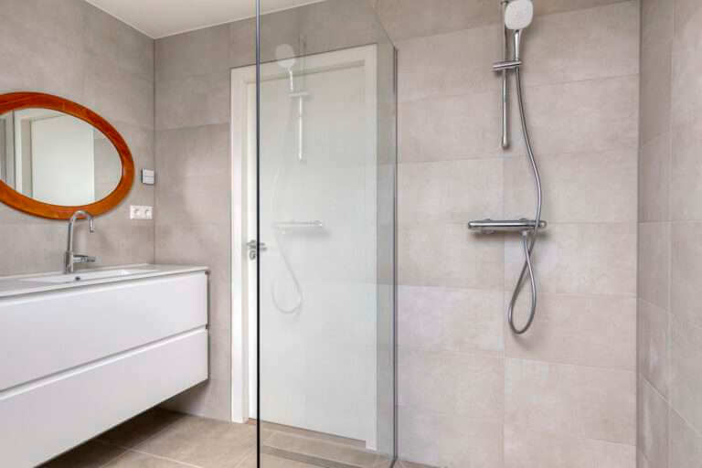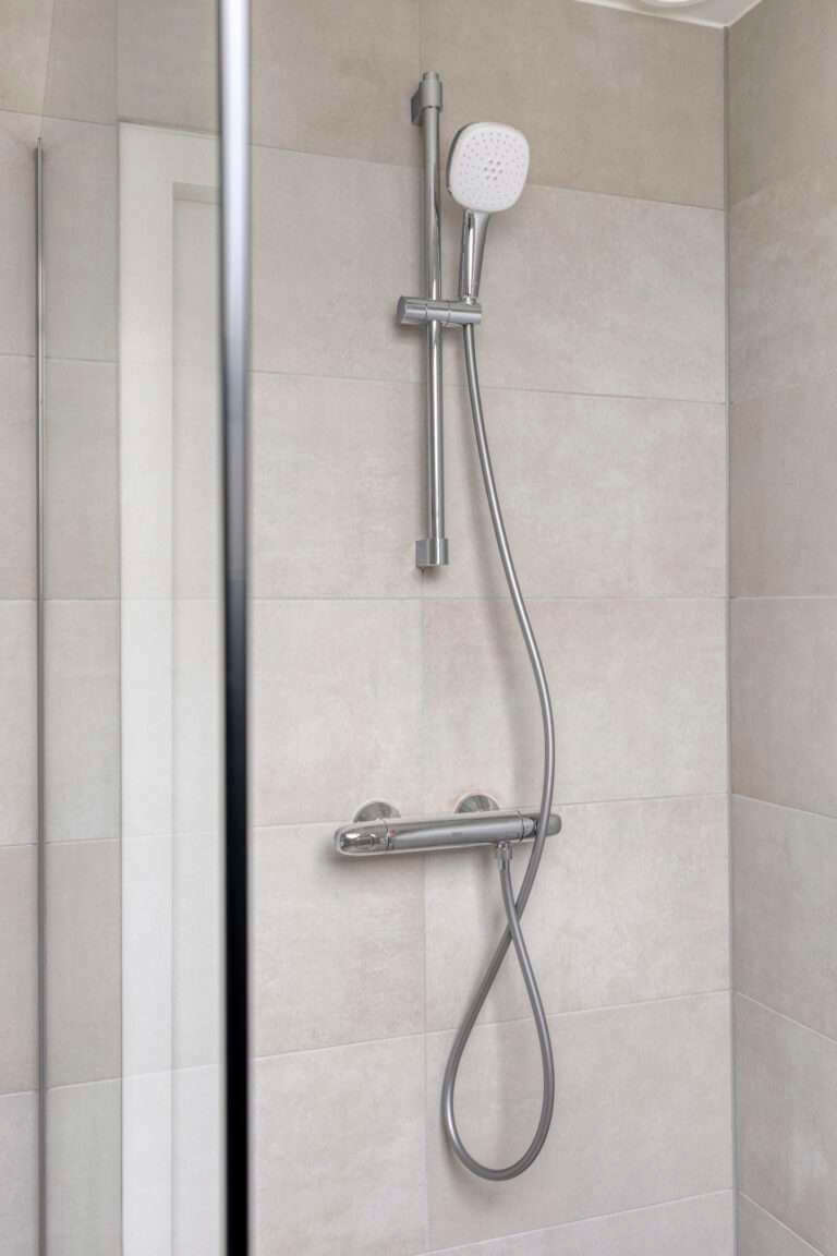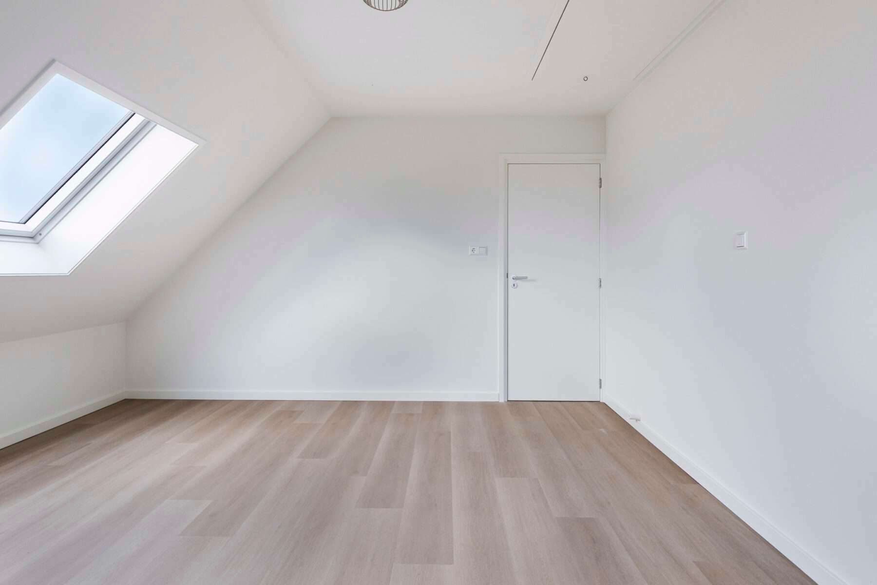 The playful living room is located at the front of the flat and offers many layout options. From the living room, you have direct access to the large and bright kitchen, which is the heart of this flat. The spacious kitchen includes a fridge-freezer, induction hob with extractor fan and a dishwasher. Both bedrooms and the bathroom are accessible from the kitchen. The bathroom has a washbasin, walk-in shower and wall-mounted toilet.