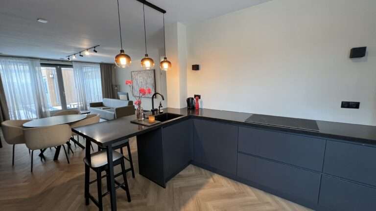 The modern and bright kitchen is equipped with a beautiful composite worktop with breakfast bar and has various built-in appliances, such as: a 4-burner induction hob with Bora extractor fan, dishwasher, combination microwave and fridge.