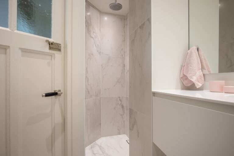 The bathroom has a walk-in shower, toilet and washbasin. The washing machine is locatied in the attic, two floors up.