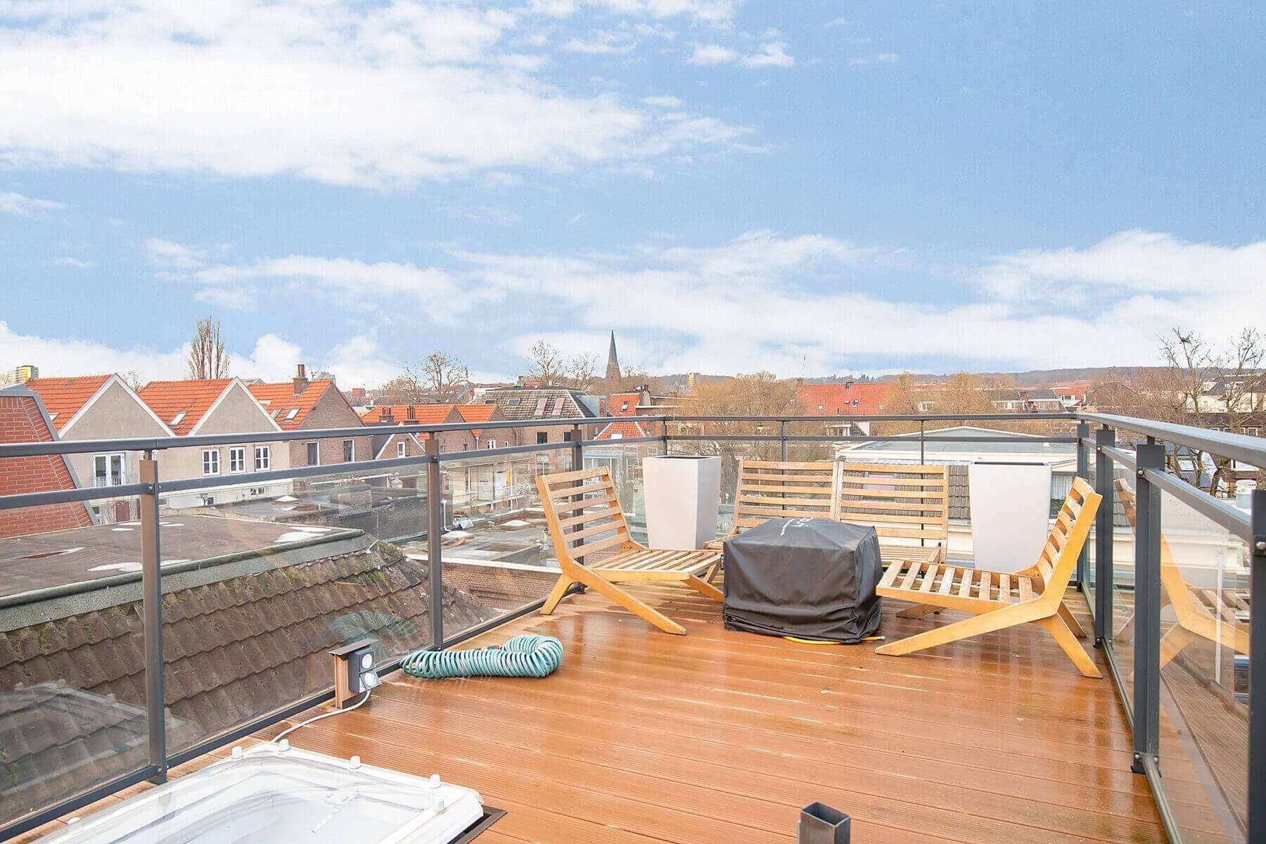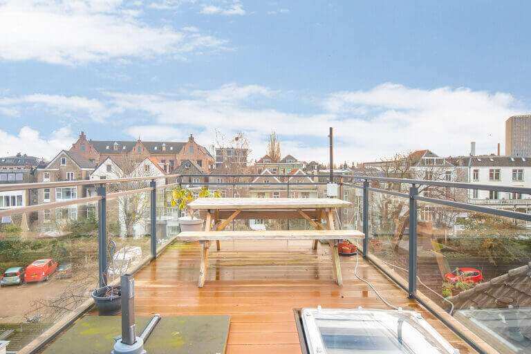 The roof terrace with panoramic views is accessible from the master bedroom and is also wonderfully sheltered by the glass fence.
