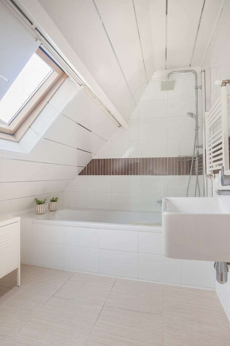 Stairs to second floor, under the high ceilings with beams are located the very spacious master bedroom with washbasin, second bedroom and bathroom. On the landing are fitted wardrobes realized.