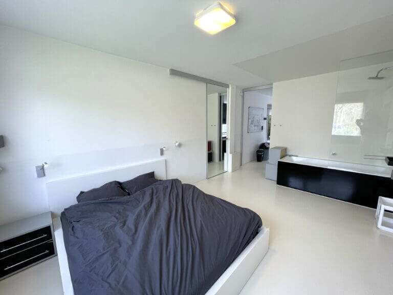 The spacious and bright bedroom has a built-in wardrobe, a bath with rain shower and a sink.