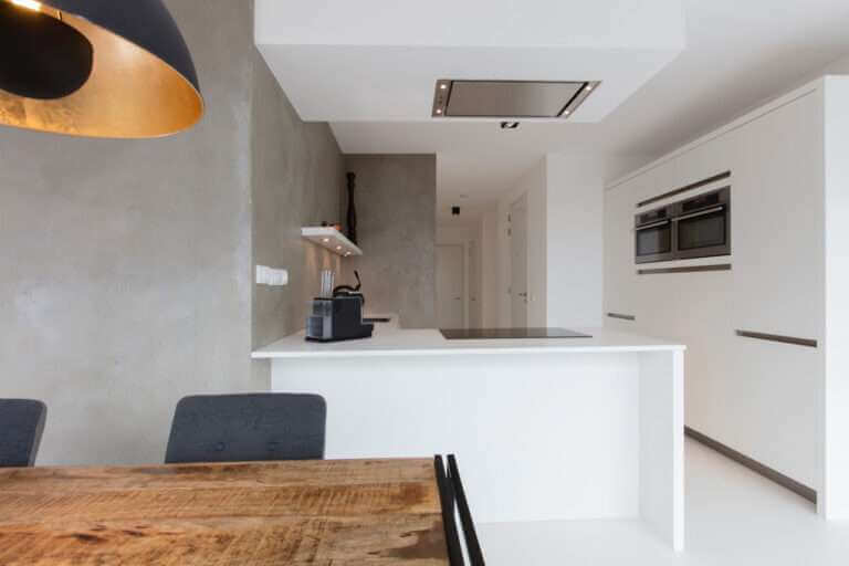 Luxurious modern kitchen. The huge terrace is accessible from the living room and from the kitchen.