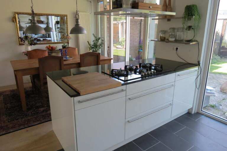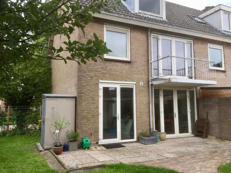 Ground floor; Entrance hall, toilet, meter closet, staircase upstairs, access to bright living and dining room with wooden floor and the open kitchen with patio doors to the beautiful garden facing south with carport. The kitchen is equipped with a cooking island with a composite worktop, a 5-burner gas cooker, an extractor hood, oven, microwave, fridge with freezer, dishwasher and has plenty of storage space. The garage in the garden is not part of the rented housing.