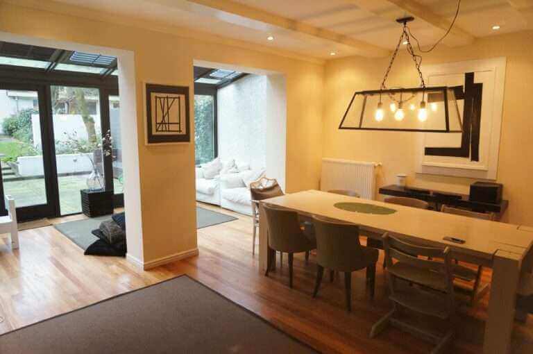 The living room and kitchen are located at the canal. The four bedrooms, four bathrooms and office are situated on the ground floor. Here is also the 2nd kitchen, large conservatory and large garden with guest house situated.