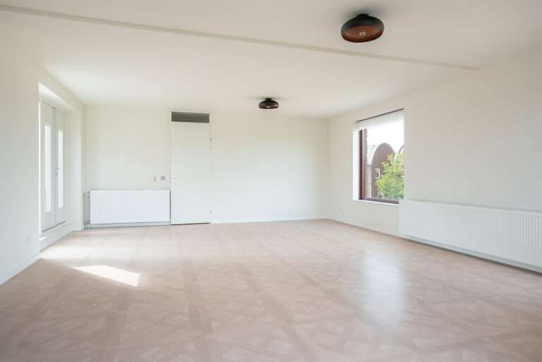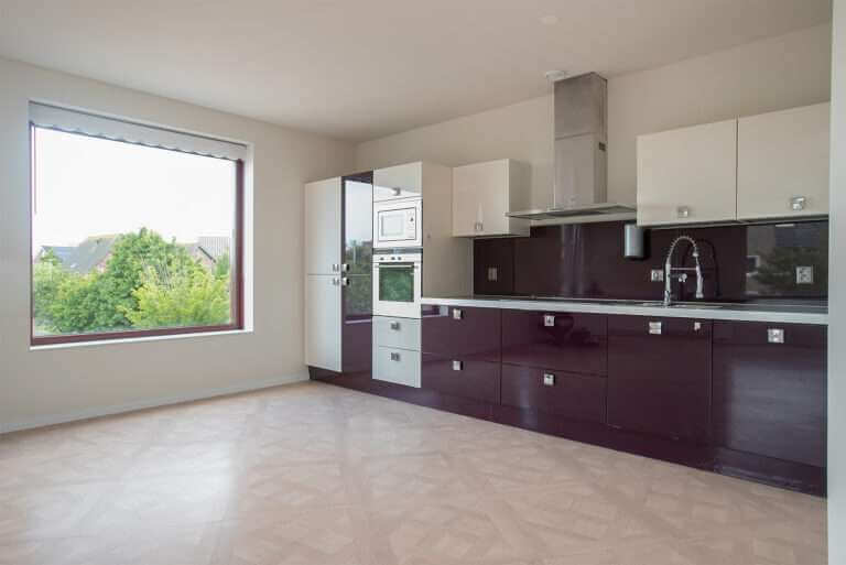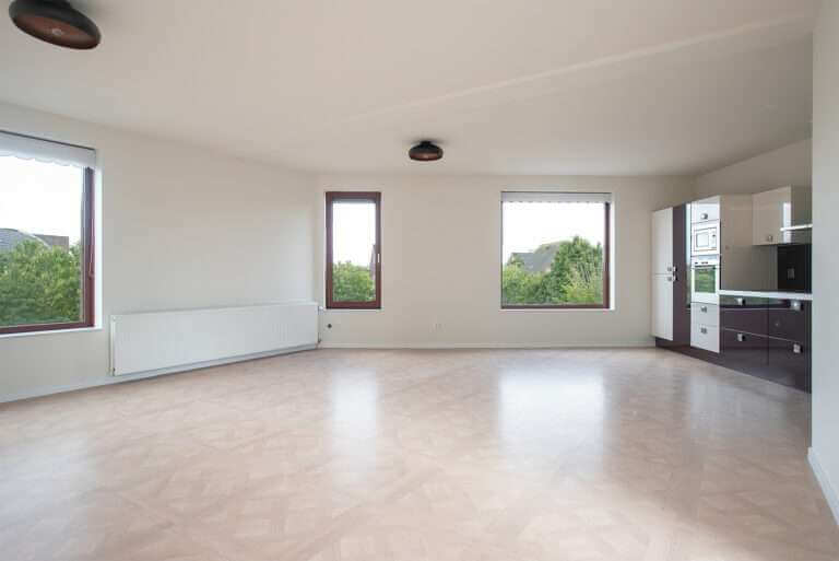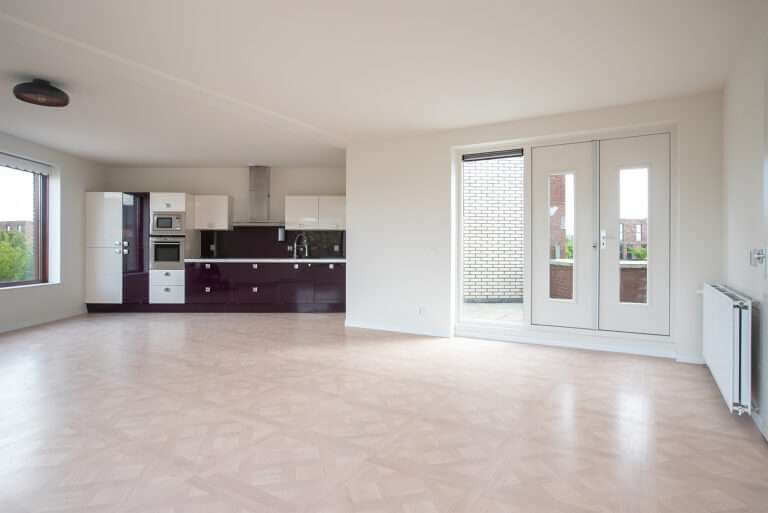 When you step into the livingroom, you will notice right away there will be no lack of light here due to the large windows. Here you will also find the open plan kitchen which is perfect to entertain visitors, while you’re cooking a meal.