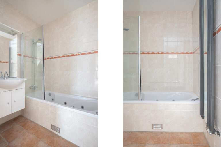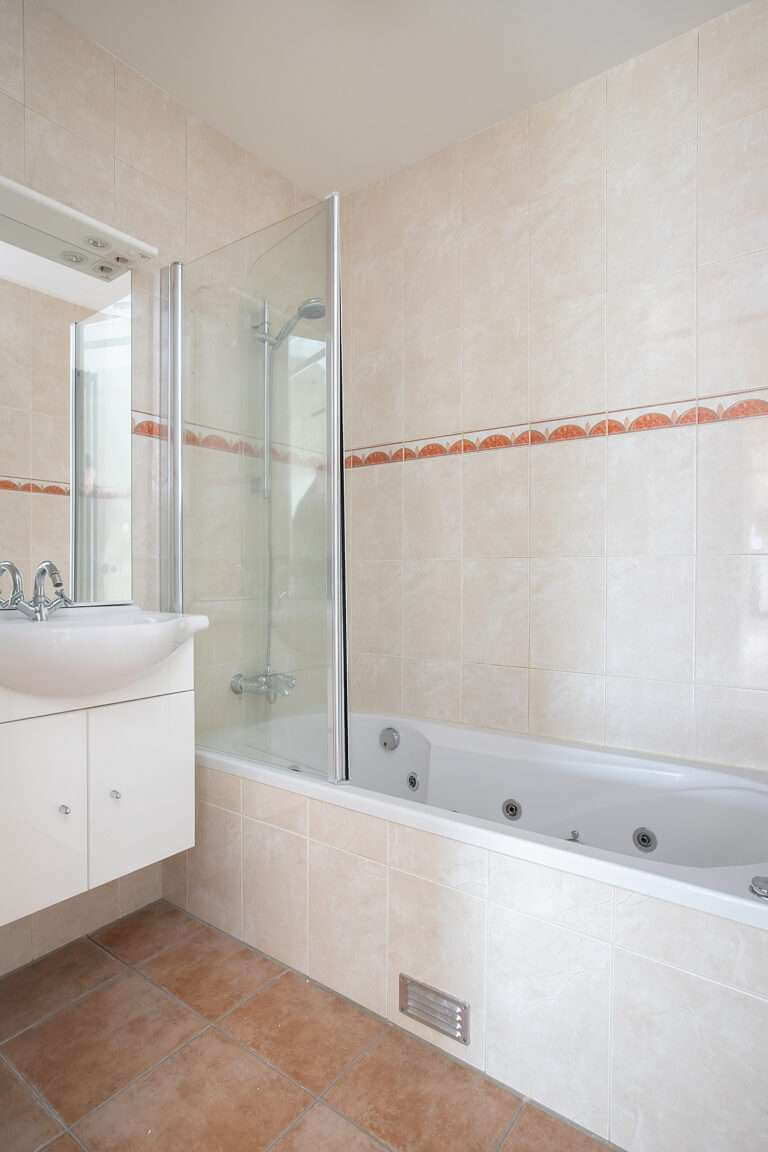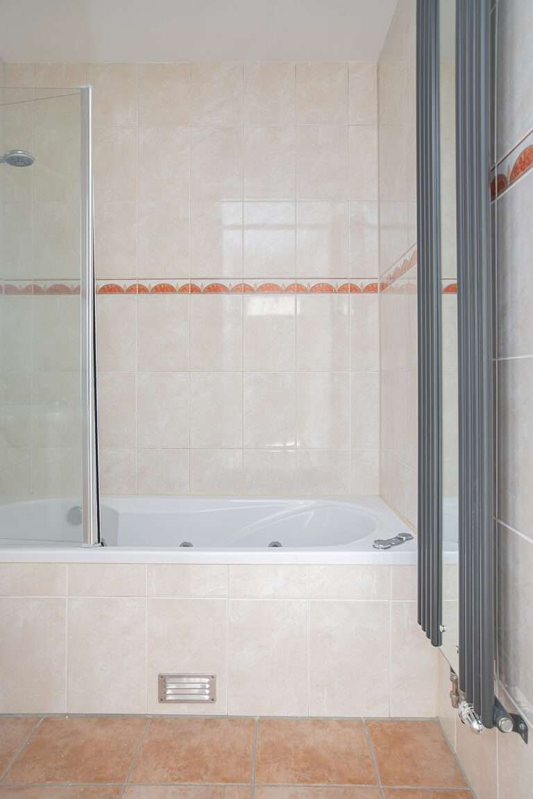The house has three spacious bedrooms, one of which is now staged as a home office. The bathroom has a bath with shower, sink, storage space and design radiator.