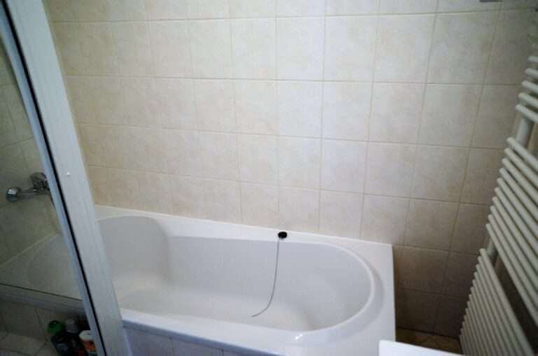 In addition to a bath, the bathroom also has a separate rain shower.