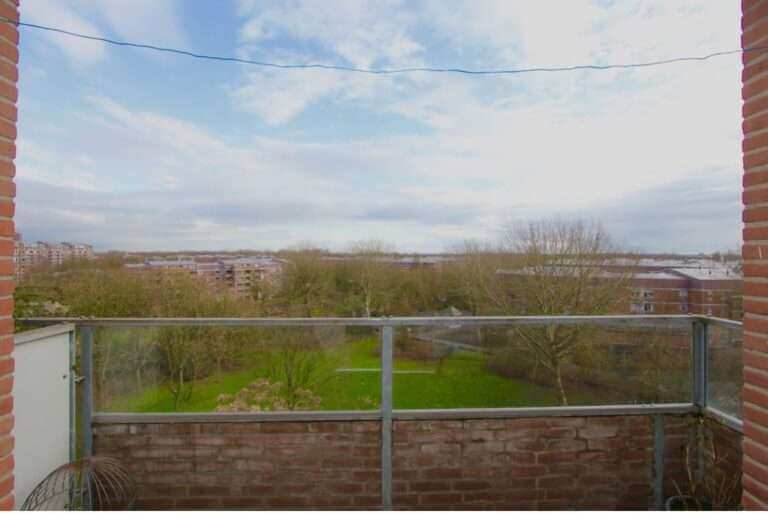 Because of the large windows, the living room and kitchen have plenty of light. From the living room and from the balcony you have a beautiful view over the park with playground, playground and impressive tree party.