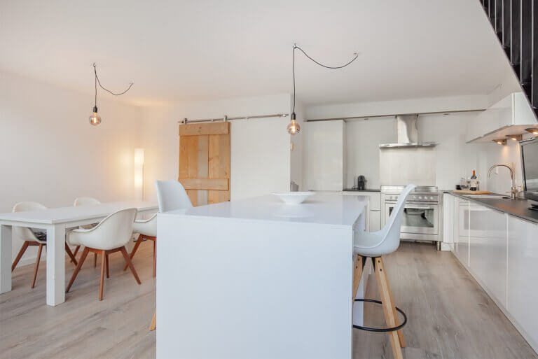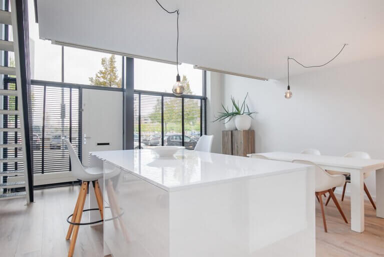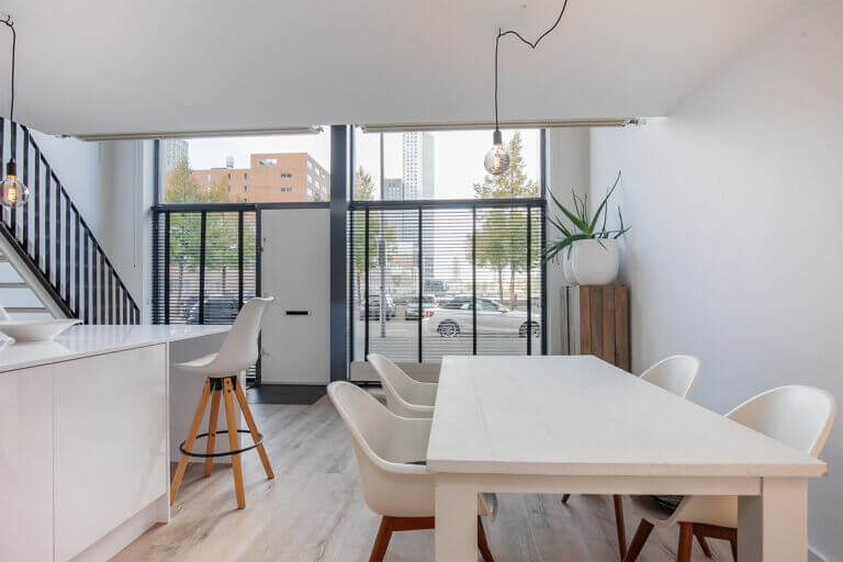 Enter this unique home! Due to the enormous windows from the floor to the ceiling and the loft, the entire house is wonderfully lit with daylight. The ground floor is currently used as a kitchen diner, but you can of course also work fine from this space. This fantastic kitchen is equipped with various modern appliances such as a ceramic hob, stainless steel extractor hood, oven, fridge / freezer, a dishwasher and lots of cupboard space.