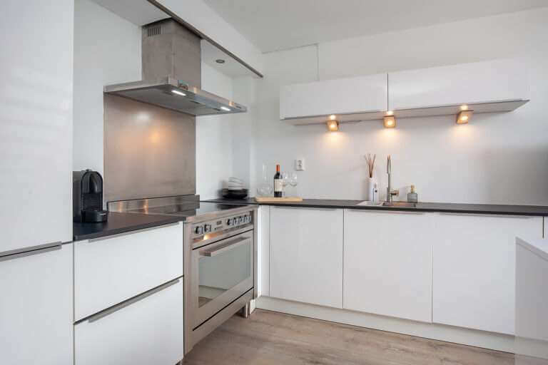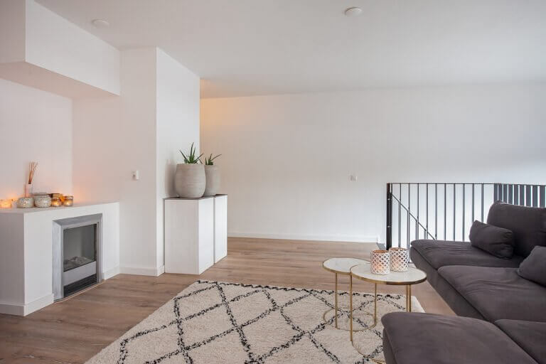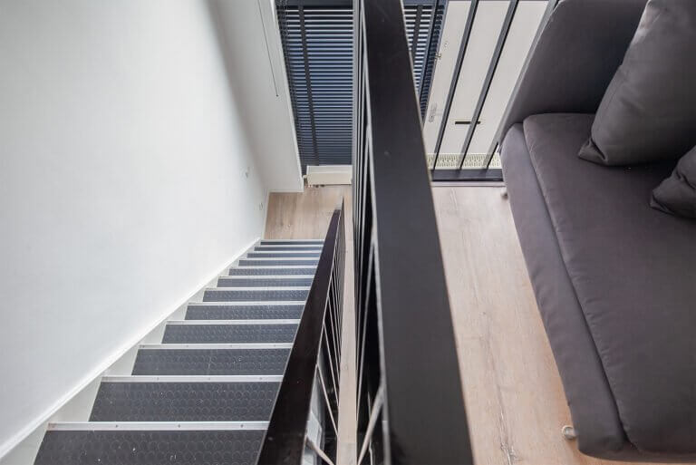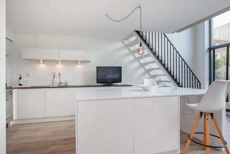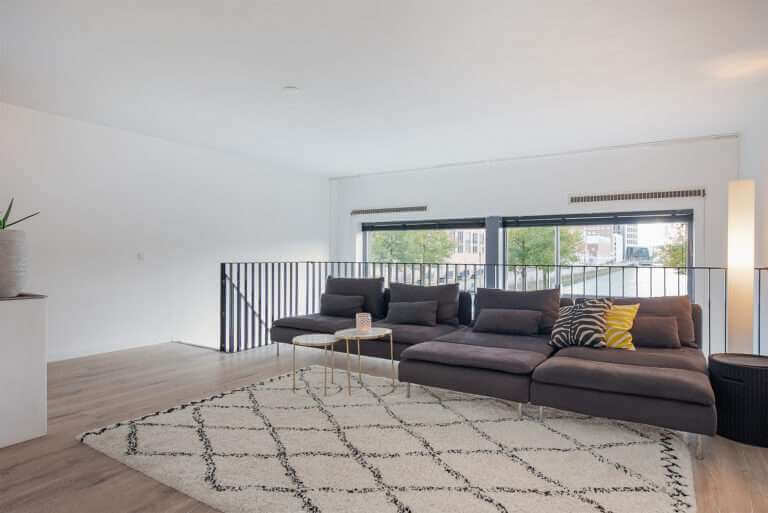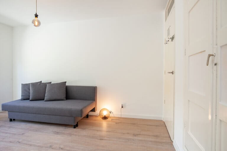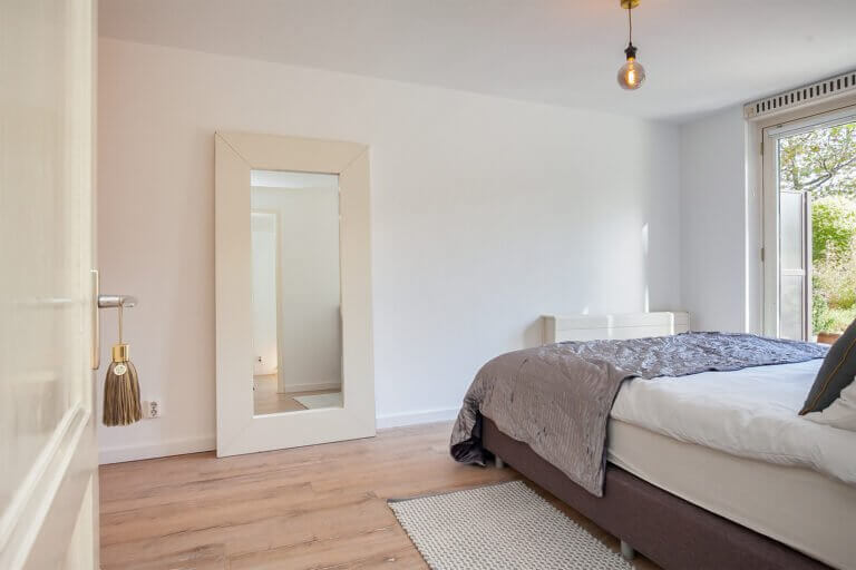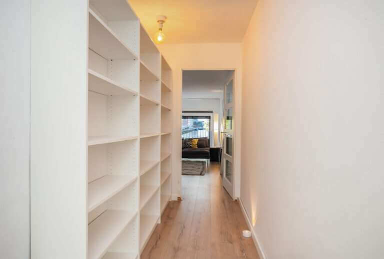 In the lounge area you can sit comfortably on the couch in the evening and enjoy a fantastic view of the Spoorweghaven and cityscape. Both on the right and the left side of this room behind beautiful white doors is a hallway to the two bedrooms of the house. On the way to the 2nd bedroom you will find access to the modern bathroom and toilet in the right hall. The bathroom has a walk-in shower with rain shower, bath with shower function, a single washbasin with casing and a design radiator.