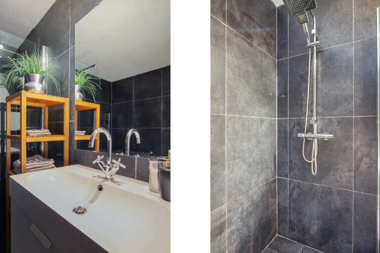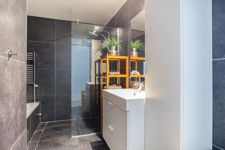 • Bathroom with walk-in shower, bath, washbasin with casing and design radiator;