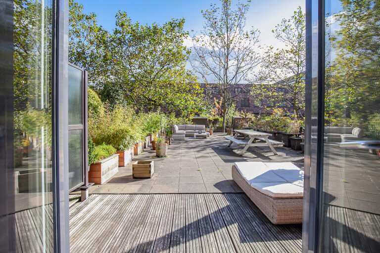 The left hall provides access to the cozy master bedroom with fitted wardrobes. Through the master bedroom you reach the sunny roof garden of no less than 90m2 through French doors. The roof garden is located on the southeast and offers access via a staircase to the parking garage located at the rear of the building.