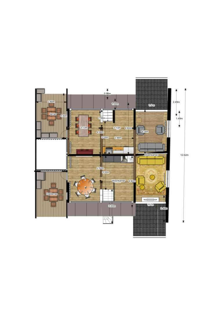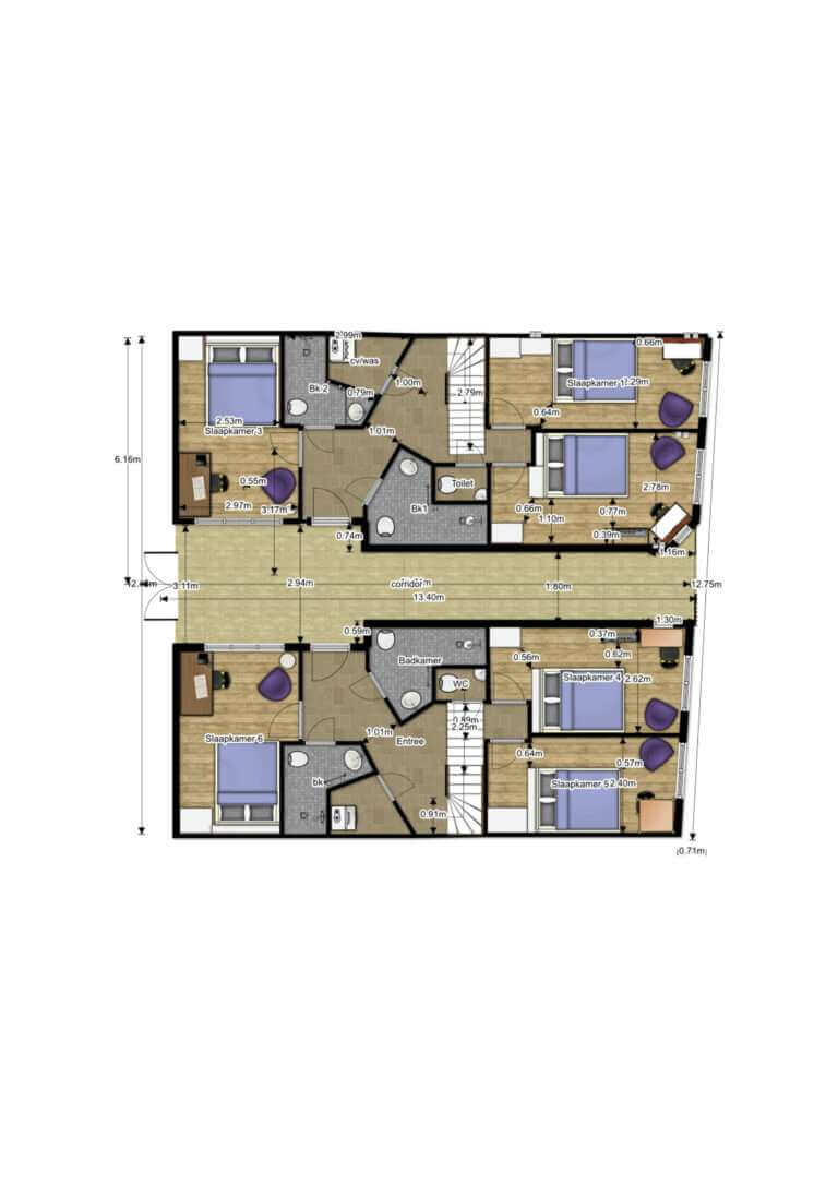 The entrance of the apartment gives access to the hall of the apartment. From this hall you reach the three bedrooms on the ground floor and two bathrooms. The two beautiful bathrooms are fully tiled in white and are equipped with a shower, sink and toilet. Two bedrooms are located on the front of the building. The third bedroom is located on the side of the main hallway of the building. In the hall of each apartment you will find a third guest toilet, and a room for the washer and dryer. From the hall of the apartment you reach via a fixed staircase the first floor of the apartment. The floors of the bedrooms on the ground floor are equipped with a beautiful laminate floor.