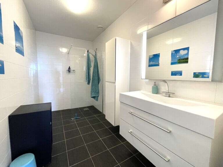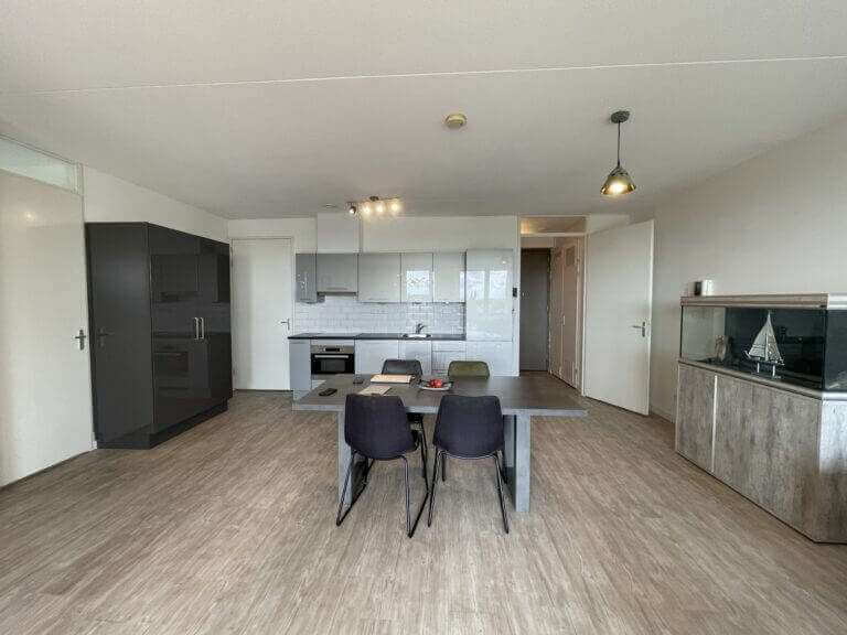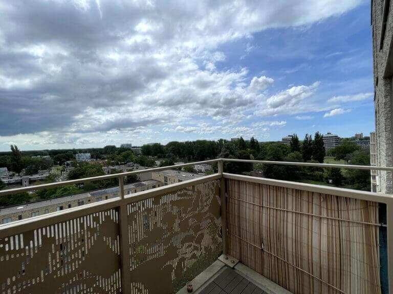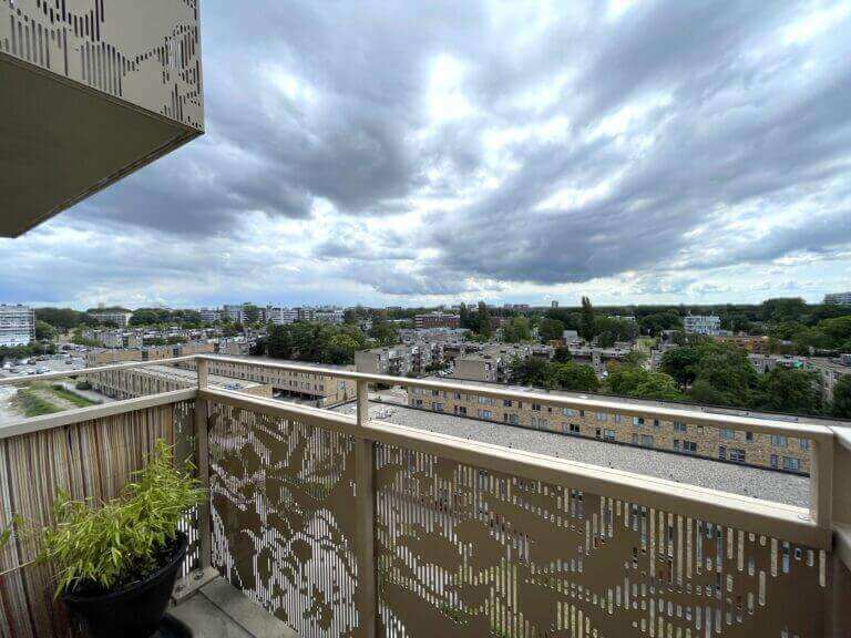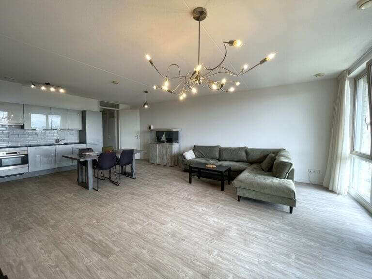 You enter a spacious and bright kitchen and living room with a wide view of Amsterdam West and the surrounding greenery. There is a modern open kitchen with a combi oven, hob, dishwasher and extractor hood. There is a large bedroom and a very neat bathroom with a walk-in shower and sink.