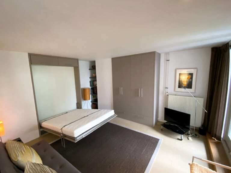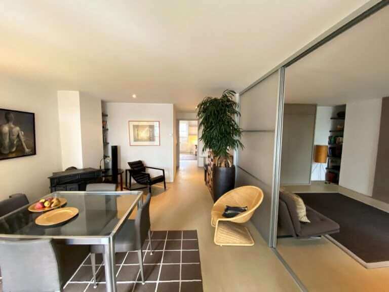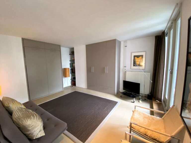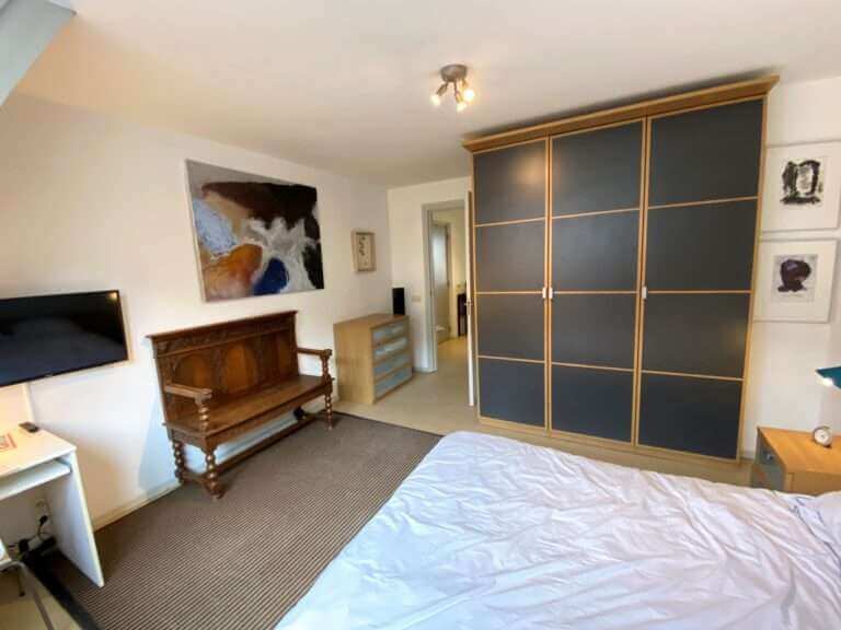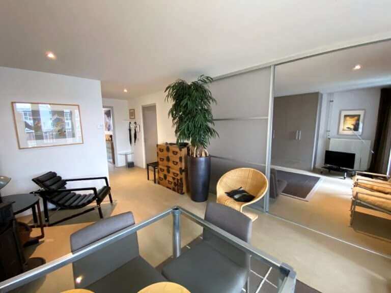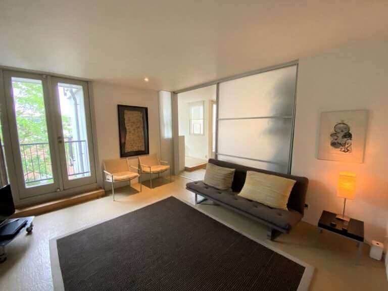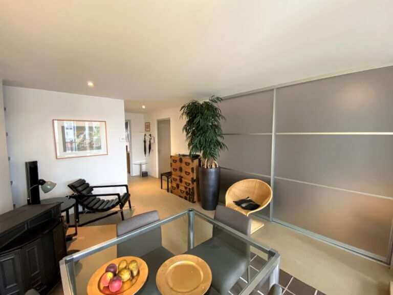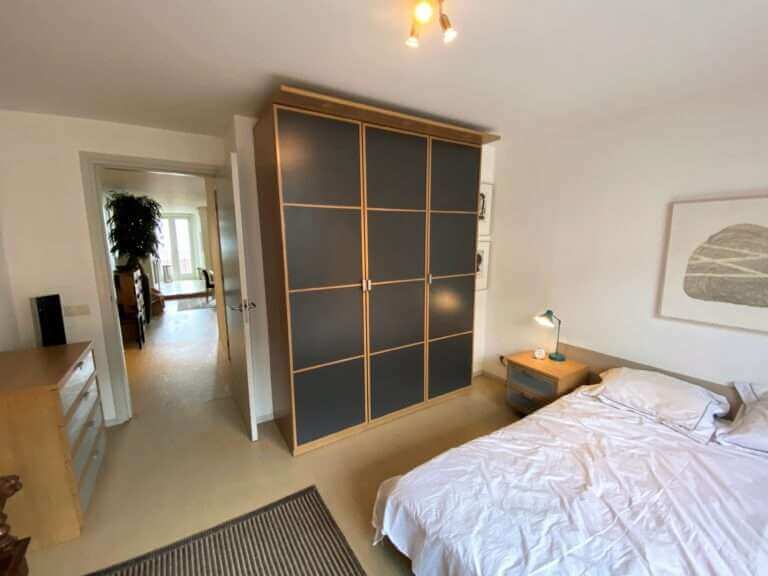 Through the large sliding doors you reach the living room, which can also be used as a guest room, with a built-in fold-out double bed. Also from here there is again access to a balcony on the South through French doors.