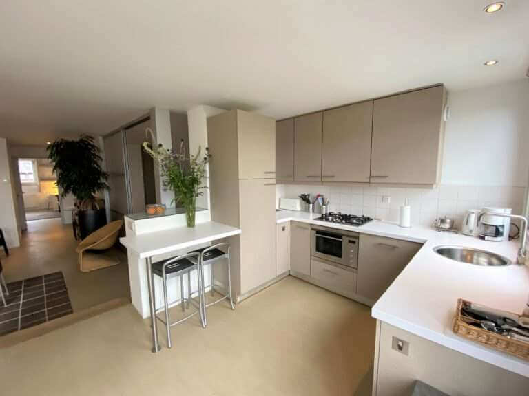 The surprisingly spacious dining room with patio doors to the balcony is adjacent to the open kitchen which is equipped with all comforts such as a 4-burner gas stove with extractor hood, built-in oven, dishwasher, and fridge-freezer.