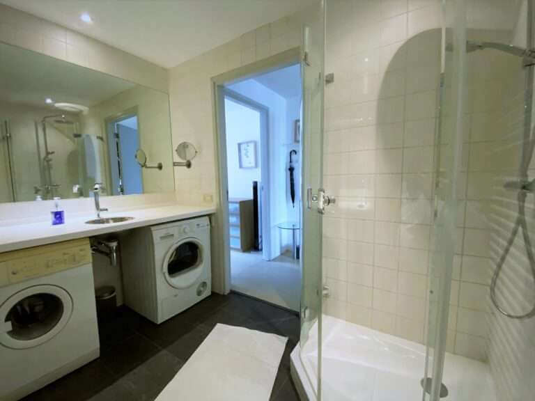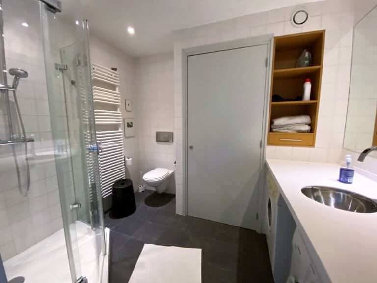 The bathroom is also wonderfully spacious with a shower cabin, toilet, sink with top and design radiator. Here are also the washing machine and dryer.