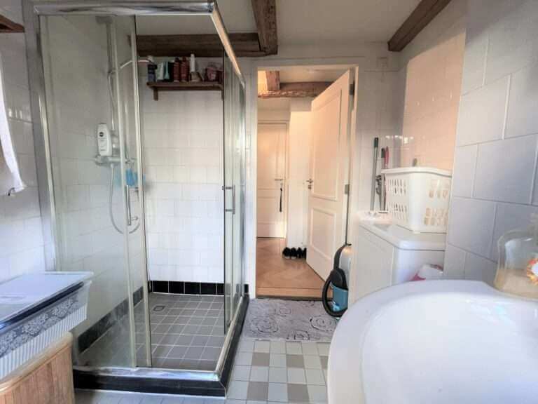 The bathroom is spacious and equipped with a walk-in shower and sink. Here is also the washing machine.