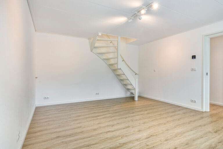 Entrance hall with meter cupboard and access to all rooms on the ground floor. Bedroom at the front of the house, kitchen equipped with various built-in appliances such as a combination oven/microwave, refrigerator, freezer, dishwasher, ceramic hob, extractor hood, and sink. From the kitchen, you reach the storage room/utility room with a heat pump, and the back door provides access to the beautiful back garden. At the front of the house is the living room with a staircase to the second floor.