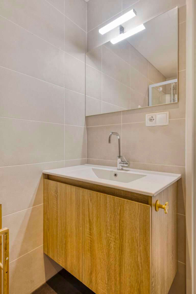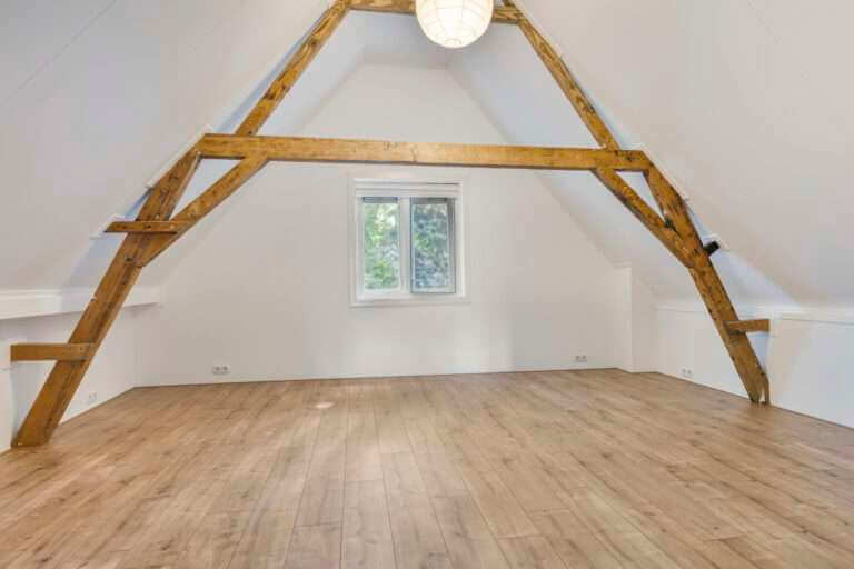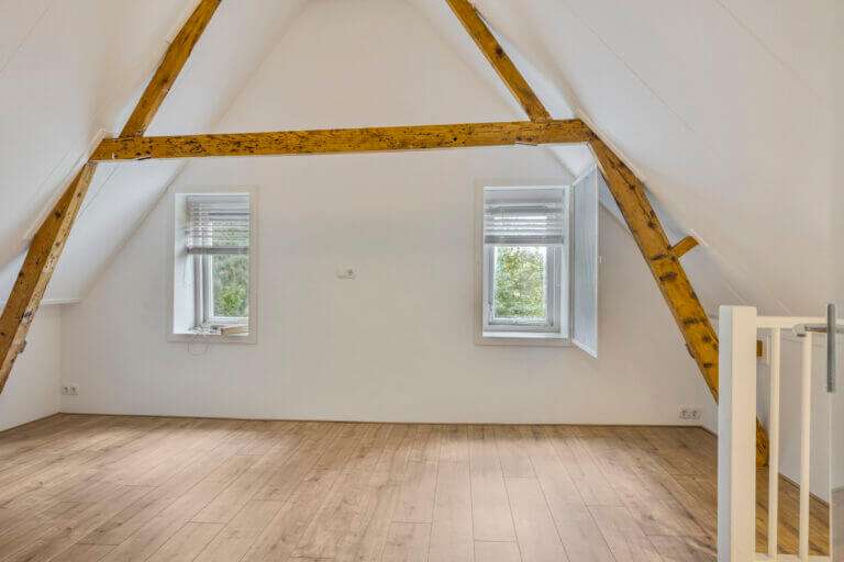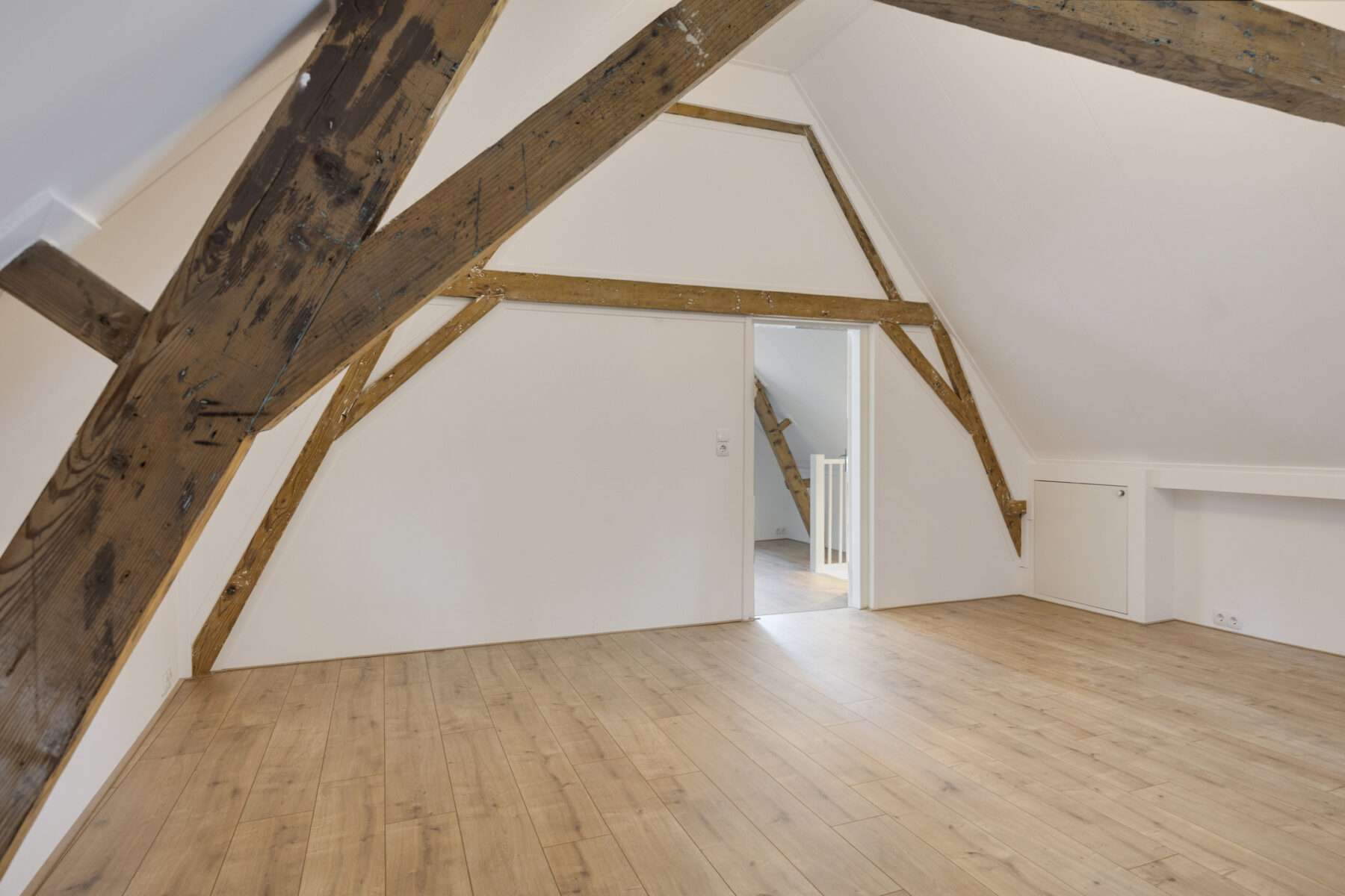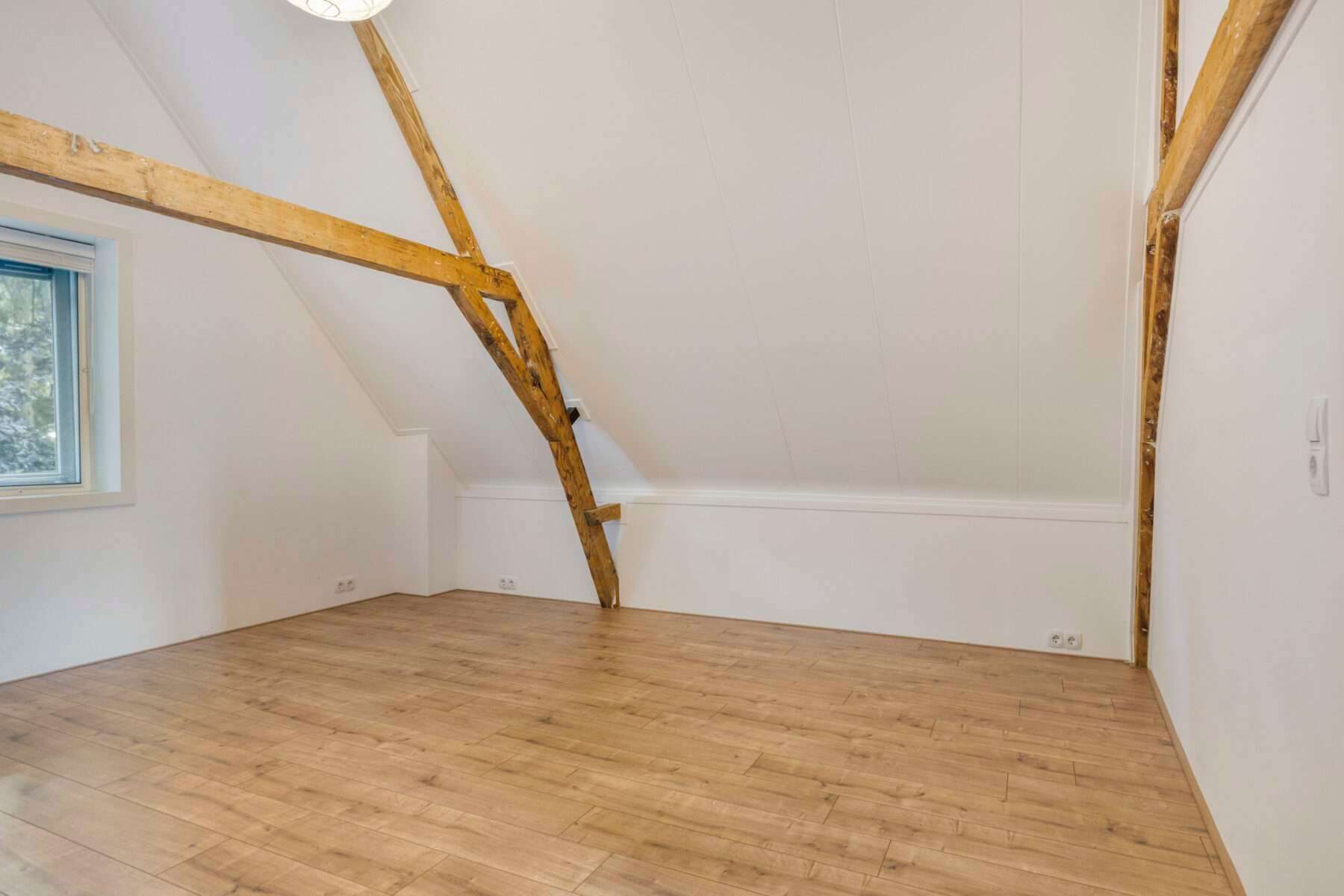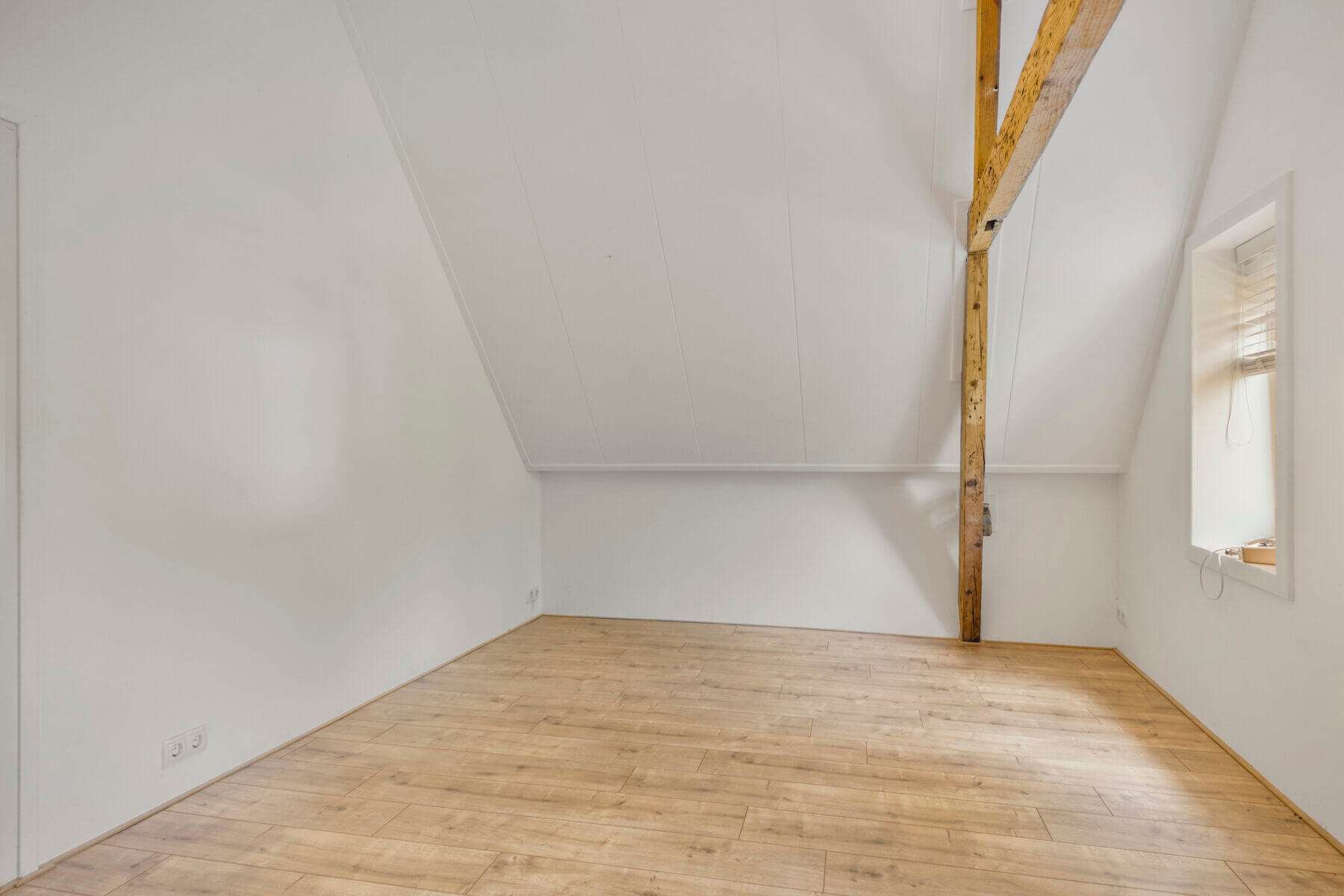 A staircase leads to the sleeping area with a landing, which can be used as a study. From the landing, you enter a charming bedroom with a sloping roof and beautiful wooden beams.