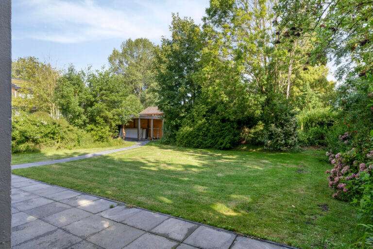 Sunny, spacious, and well-maintained garden with a terrace. Adjacent to the house is a storage shed. At the back of the garden, you’ll find a covered area, perfect for relaxing in the evenings. The covered area is equipped with 12 solar panels, making the house very energy-efficient. Adjacent to the covered area is a shed for storing garden tools, among other things.