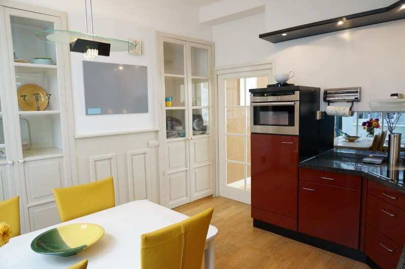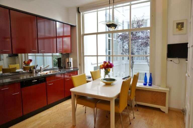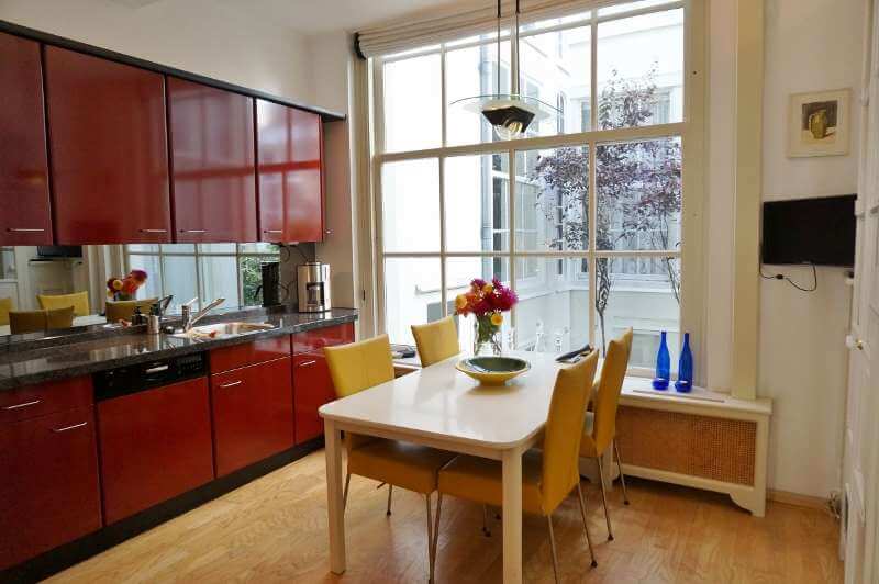 Modern closed kitchen has all appliances, lots of storage and a TV. The large windows in the kitchen give a wonderful view at the private courtyard.