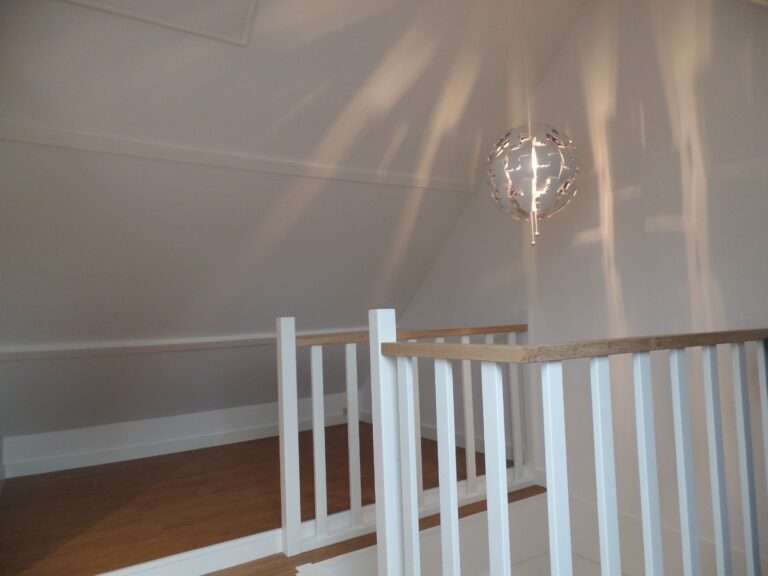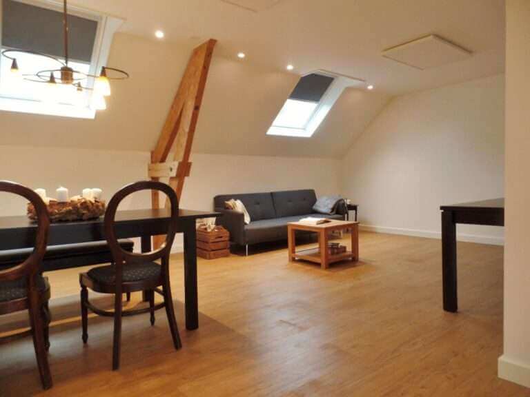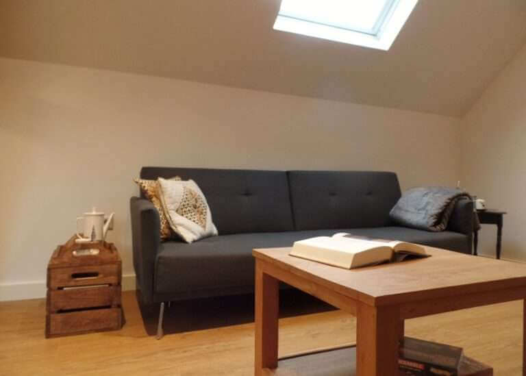 Landing with space for a guest bed and velux skylight, spacious bedroom with velux skylight.
