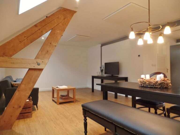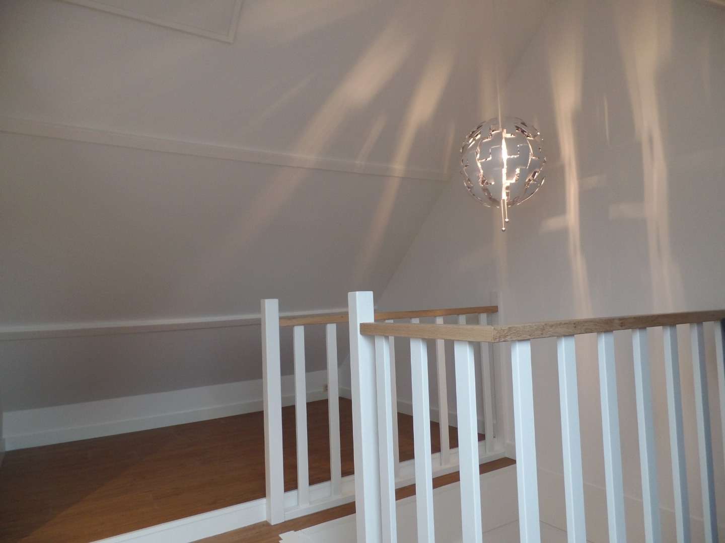 Entrance hall with access to all rooms on the 1st floor, staircase to 2nd floor and wardrobes. Then you will find a spacious living room with lots of light through the large skylights. From the living room you reach the open kitchen with sliding doors to a spacious balcony. The kitchen is equipped with various luxury appliances, such as an extractor hood, a hob, a dishwasher, a combination oven-microwave and a sink. The kitchen is also equipped with a large fridge freezer and a bar with two bar stools for a delicious breakfast in the morning. From the hall you reach the luxurious bathroom with toilet, washbasin and large walk-in shower.