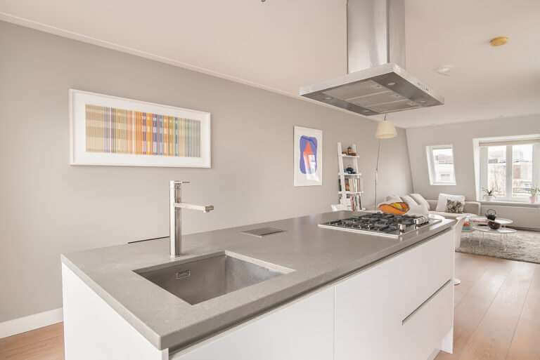 spatial atmosphere. The trendy kitchen consists of a large cupboard wall with