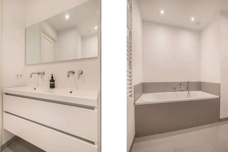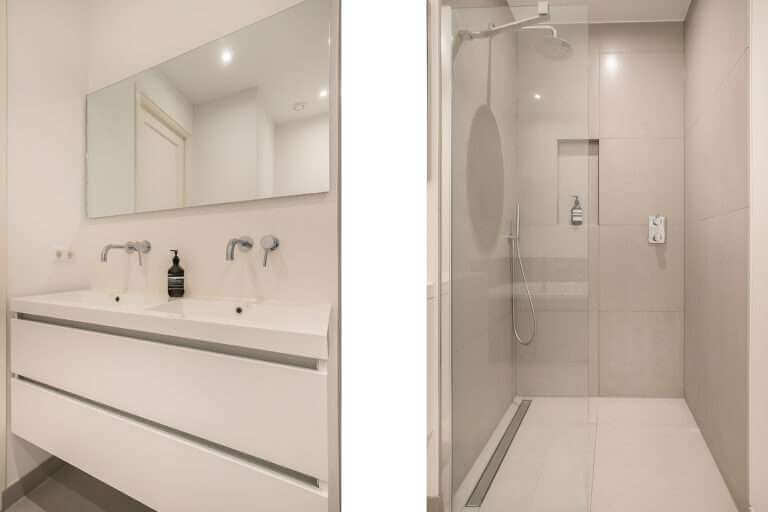 walk-in shower and double washbasin. The bathroom is luxuriously finished with